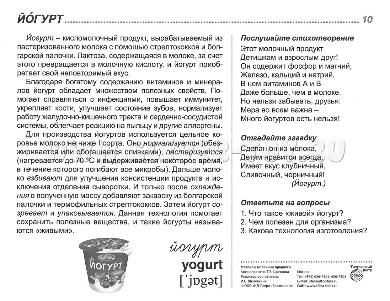 На лицевой стороне каждой карточки дается цветное изображение молочного продукта, на обратной - подробное описание, из которого дети узнают много интересного и поучительного. Для лучшего закрепления материала представлены оригинальные стихотворения и рифмованные загадки по теме, а также вопросы, на которые ребенок ответит после изучения материала или беседы со взрослым. Комплект подходит для индивидуальной и групповой работы, с детьми 5-9 лет.