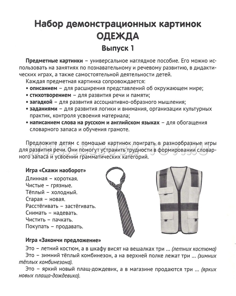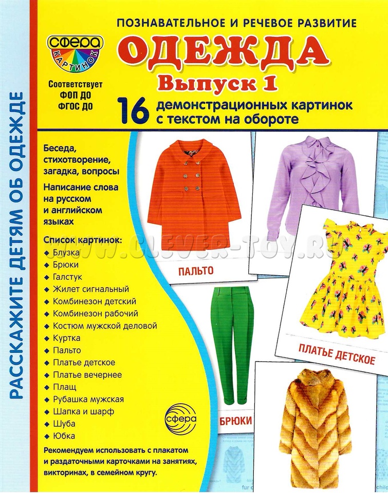 Набор карточек "Одежда. Выпуск 1" состоит из 16 цветных демонстративных карточек (картинок) и адресован детям, желающим познакомиться с видами одежды. На лицевой стороне каждой карточки дается цветное изображение, на обратной - подробное описание, из которого дети узнают немало интересного и поучительного. Для лучшего закрепления материала представлены оригинальные стихотворения и рифмованные загадки по теме, а также вопросы, на которые ребенок ответит после изучения материала или беседы со взрослым.