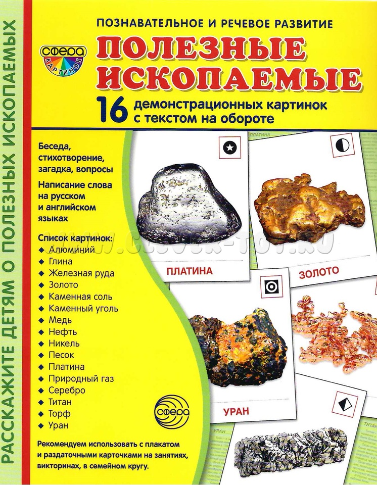 Комплект "Полезные ископаемые" состоит из 16 цветных демонстрационных карточек (картинок) и адресован детям и их родителям, желающим познакомиться с полезными ископаемыми, добываемыми на территории нашей страны.