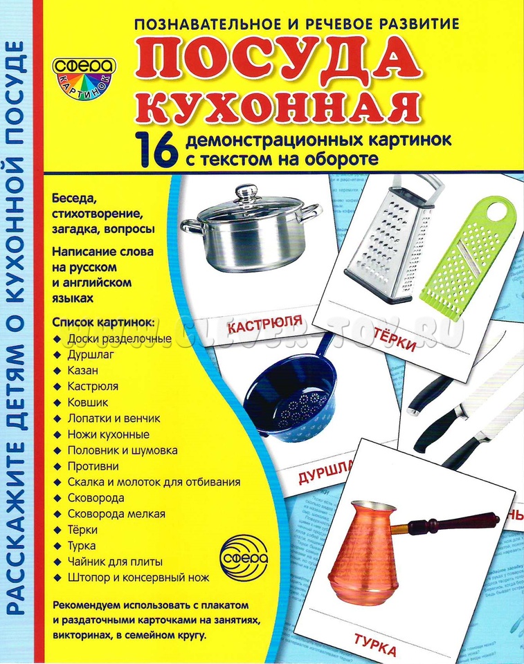 Яркие и красочные карточки помогут вашему ребёнку узнать больше о разных видах посуды и их использовании. Демонстрационные карточки помогут развить кругозор вашего малыша и расширить его словарный запас.