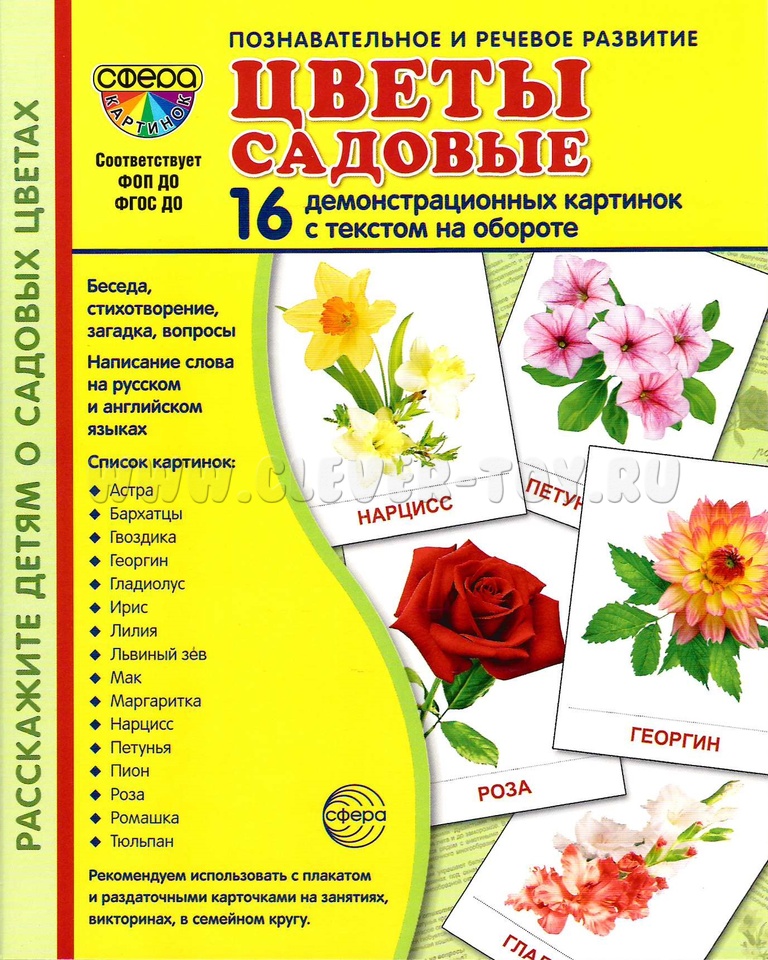 В наборе 16 ярких и сочных демонстрационных карточкек для детей "Садовые цветы" станут отличным помощником в изучении окружающего мира и развитии речи вашего ребёнка.
