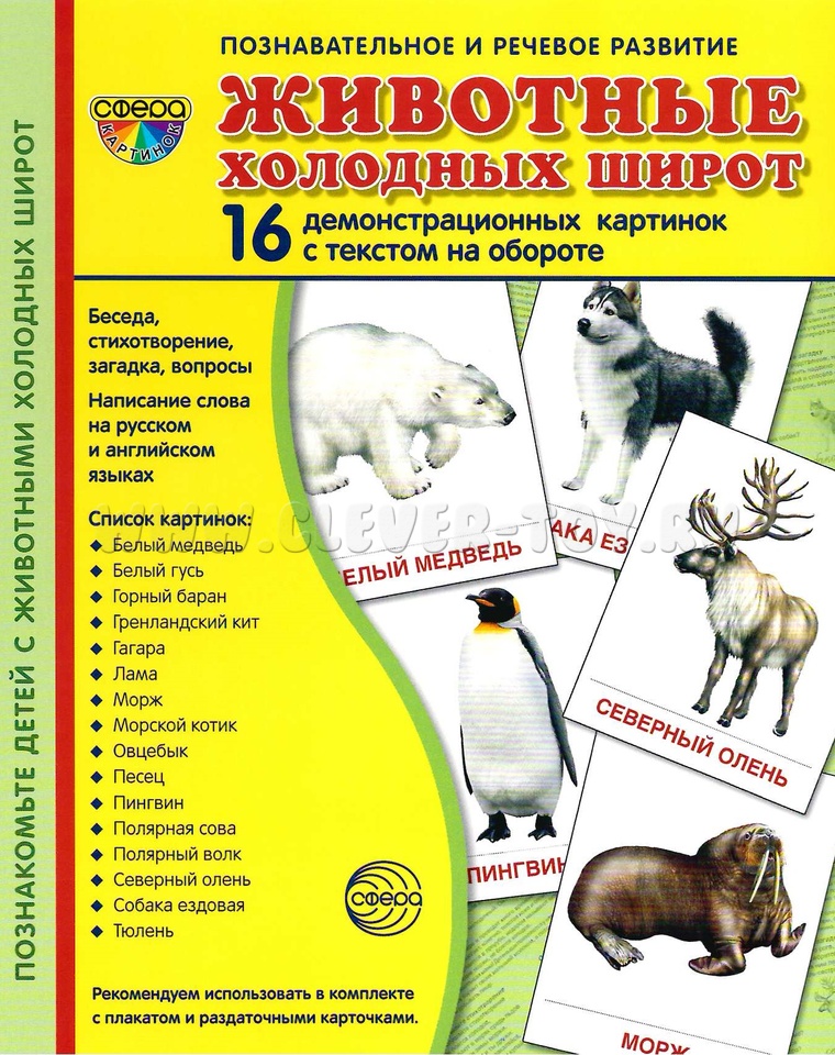 16 демонстрационных картинок для познавательного и речевого развития. На обороте каждой предметной картинки - описание, стихотворение, загадка, вопросы для ребёнка, название на русском и английском языках.