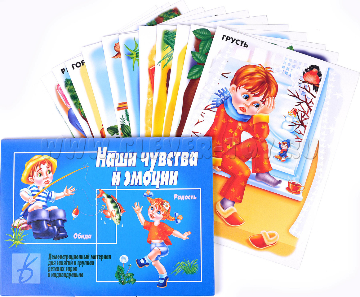 В состав набора входит 12 ярких изображений формата А4, наглядно иллюстрирующих те или иные эмоции (вина, усталость, гордость и т.д.) и папка для хранения материалов.