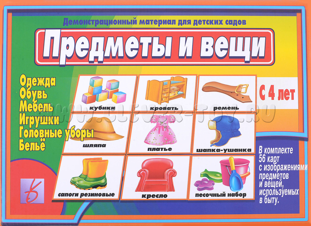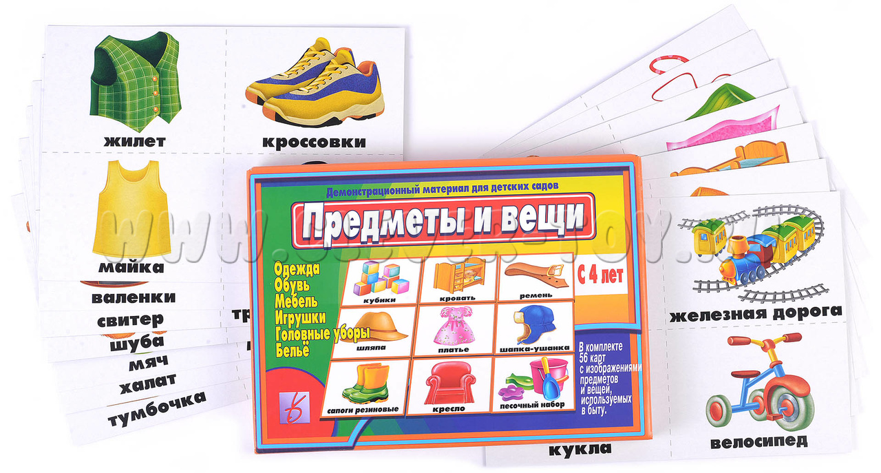 Предлагаем демонстрационный материал, знакомящий детей с вещами, которые его окружают. Изображения на картинках позволят детям детально изучить вещи и их состав, а также научиться объединять их в группу. Комплектность: 56 карточек с изображениями вещей и предметов.