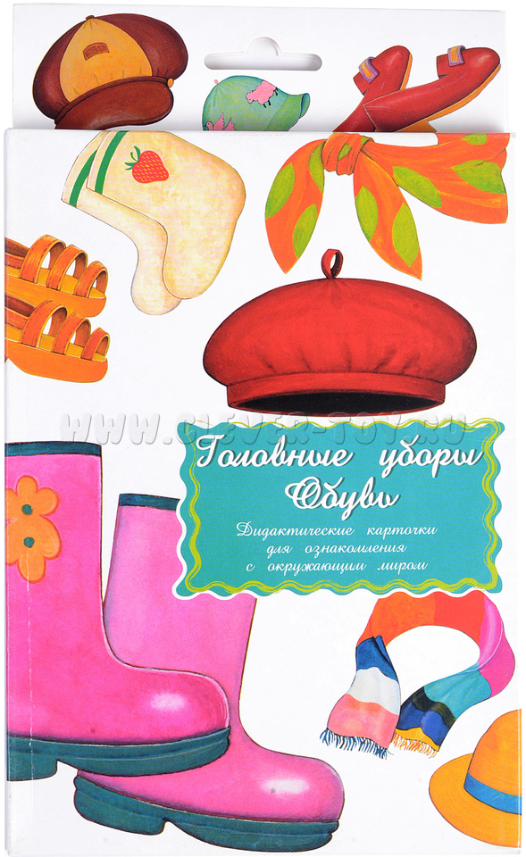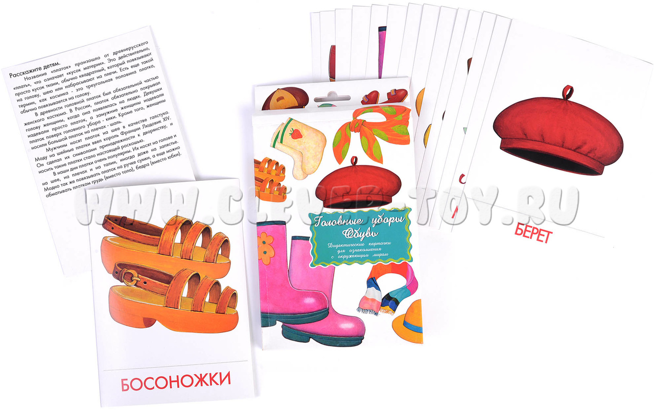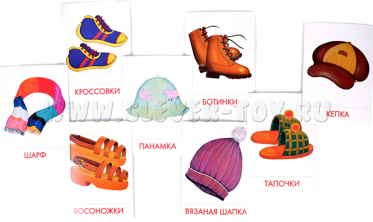 В набор входит 16 карточек с изображениями предметов одежды и обуви: