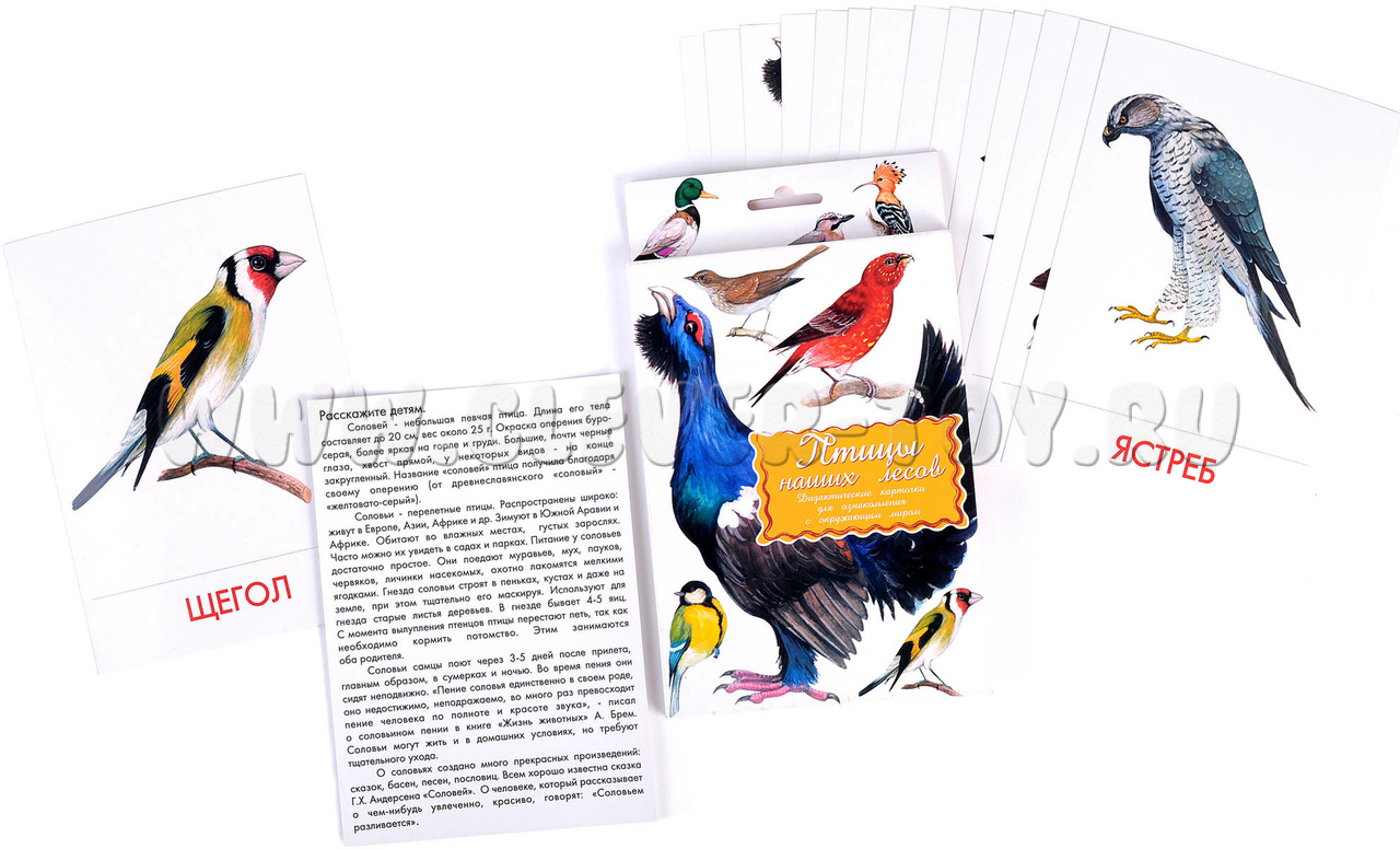 Карточки выполнены из плотного матового картона. С одной стороны нанесены рисунки, с птицами, а с другой стороны очень познавательная и интересная информация про них. Игра состоит из 16 карточек и коробки. На обратной стороне коробки написаны примеры игр с детьми. Задача этой серии расширить кругозор, словарный запас и логическое мышление.