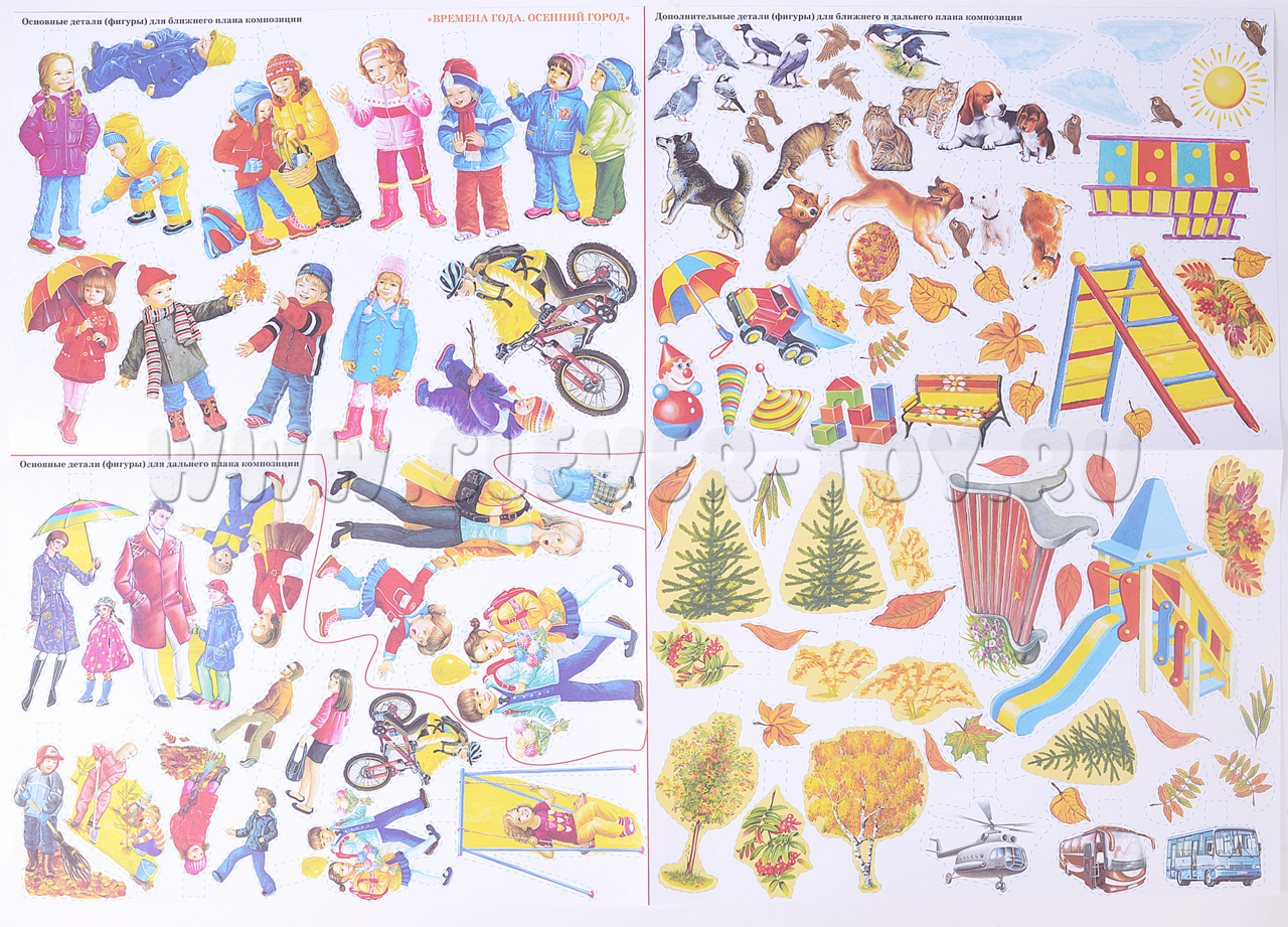 - плакат (А1) с изображением основных и дополнительных фигурок (100-150 штук) для вырезания и наклеивания на сюжетную картину;