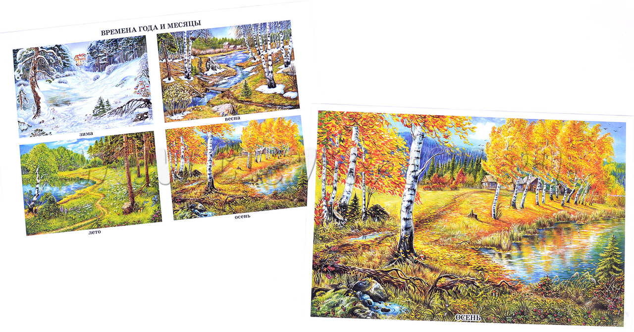 - 10 красочных изображений, иллюстрирующих изменение погоды, явления природы, виды деятельности, на обороте - список признаков осени, пословицы и приметы, загадки, планы развивающих и подвижных игр;