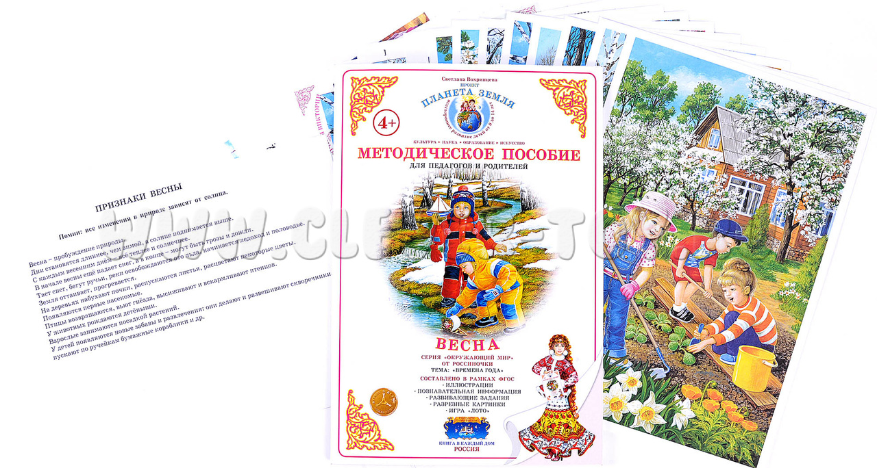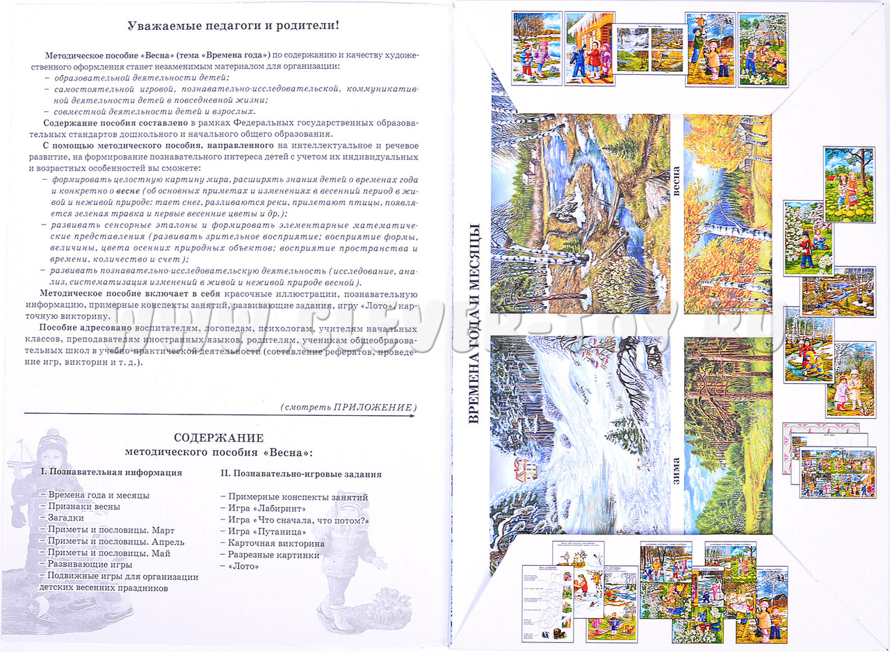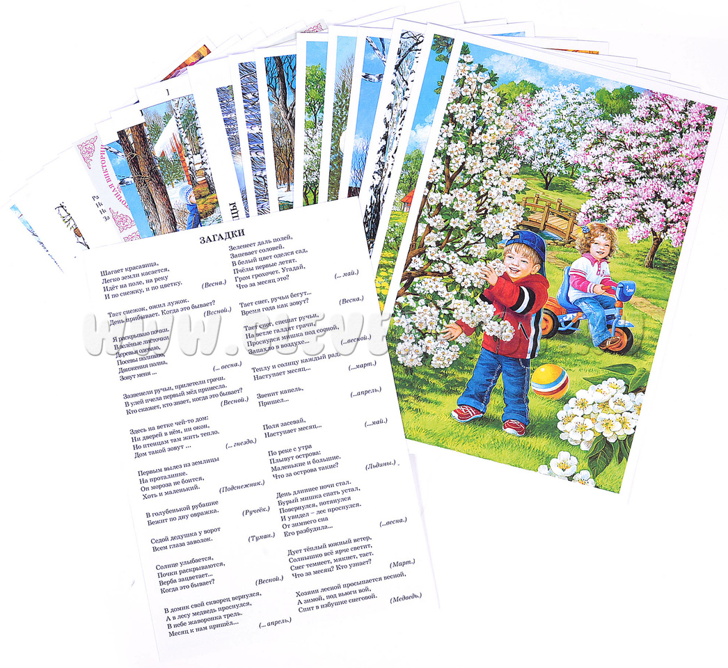 - 10 красочных изображений на тему весны, на обратной стороне листа - пословицы, поговорки, идеи для игр с детьми и тематического праздника;