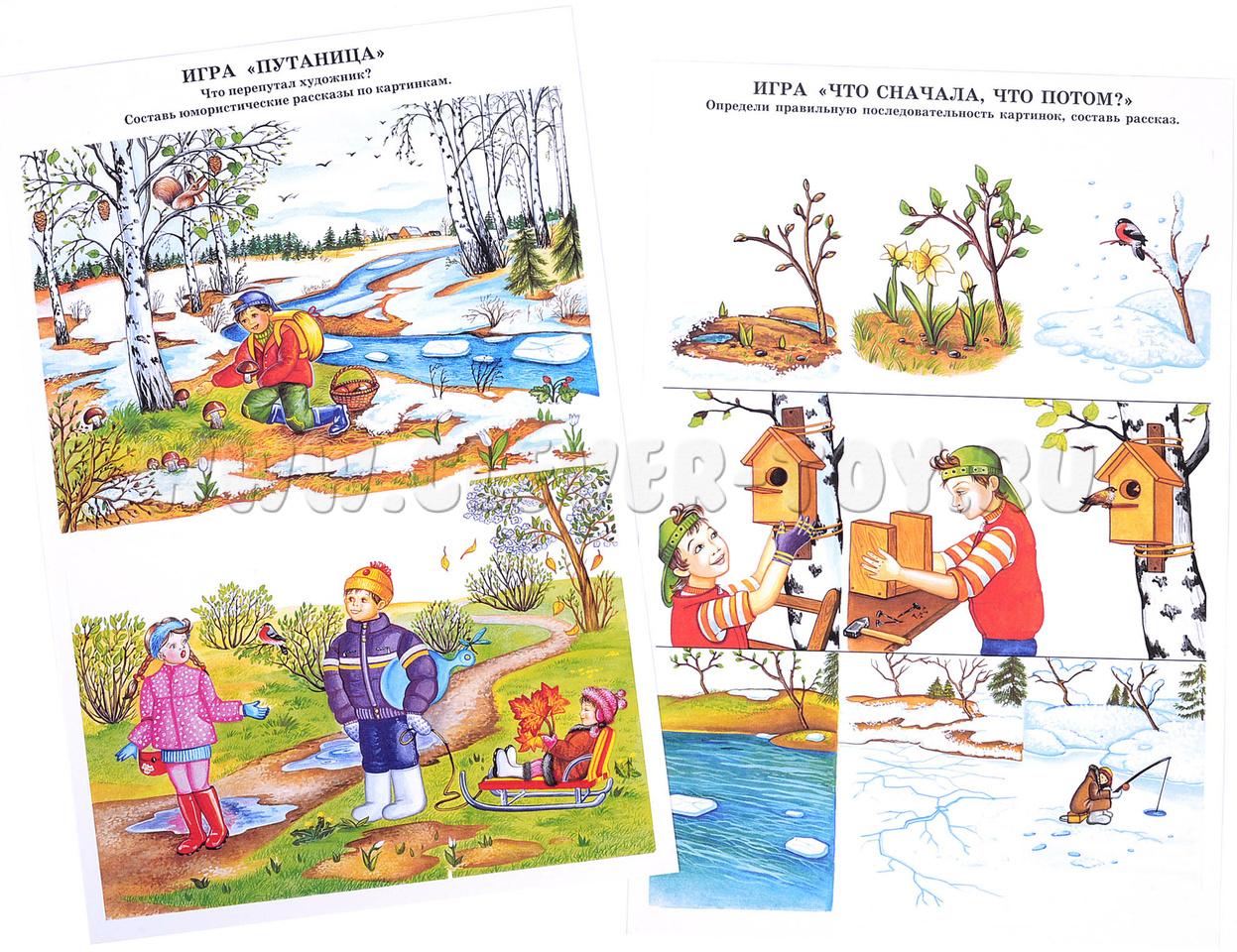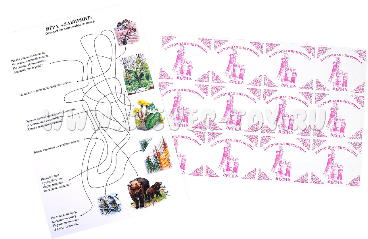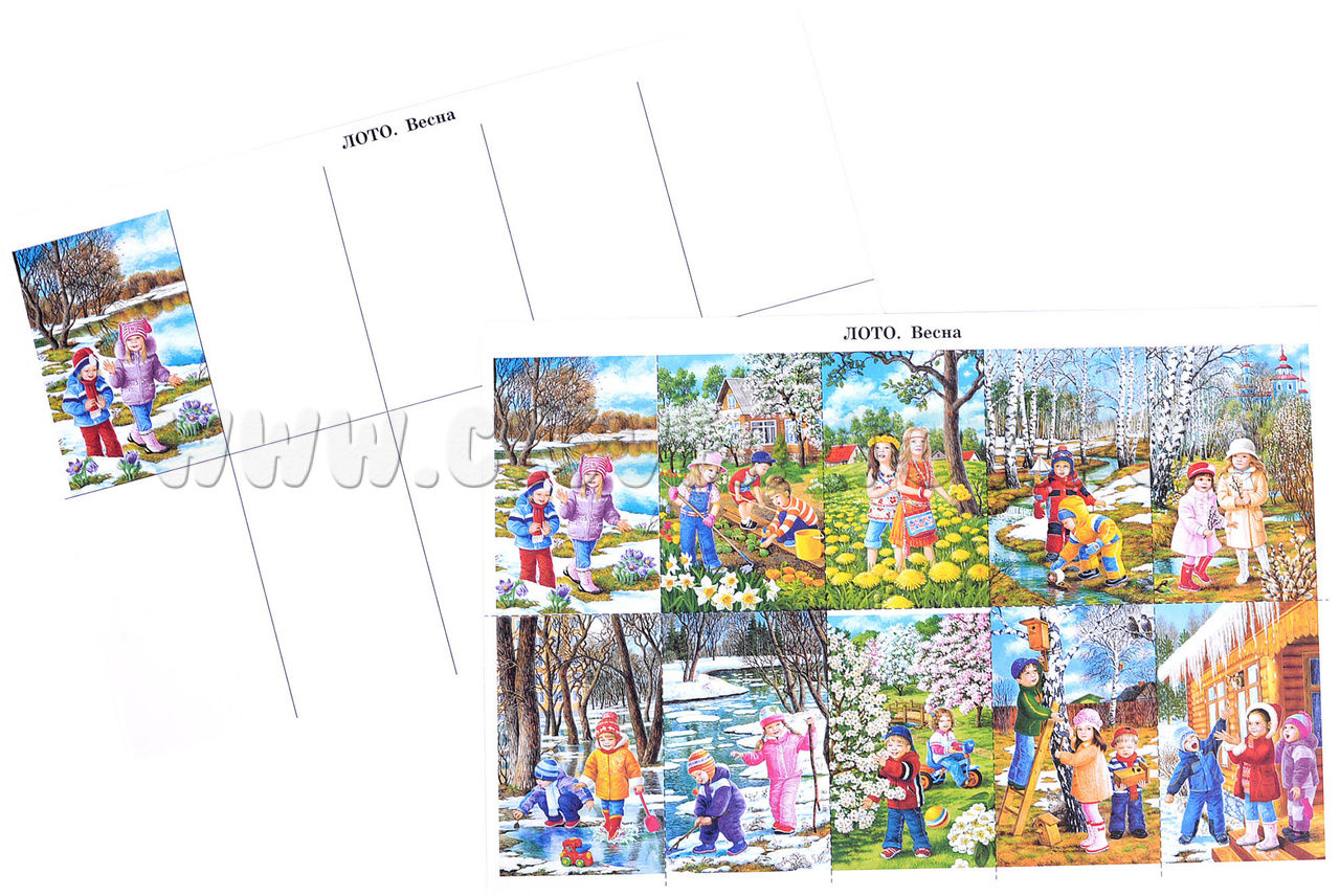 - 10 красочных изображений на тему весны, на обратной стороне листа - пословицы, поговорки, идеи для игр с детьми и тематического праздника;