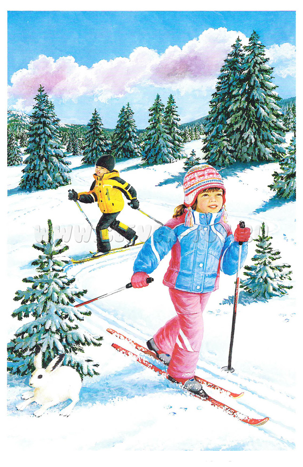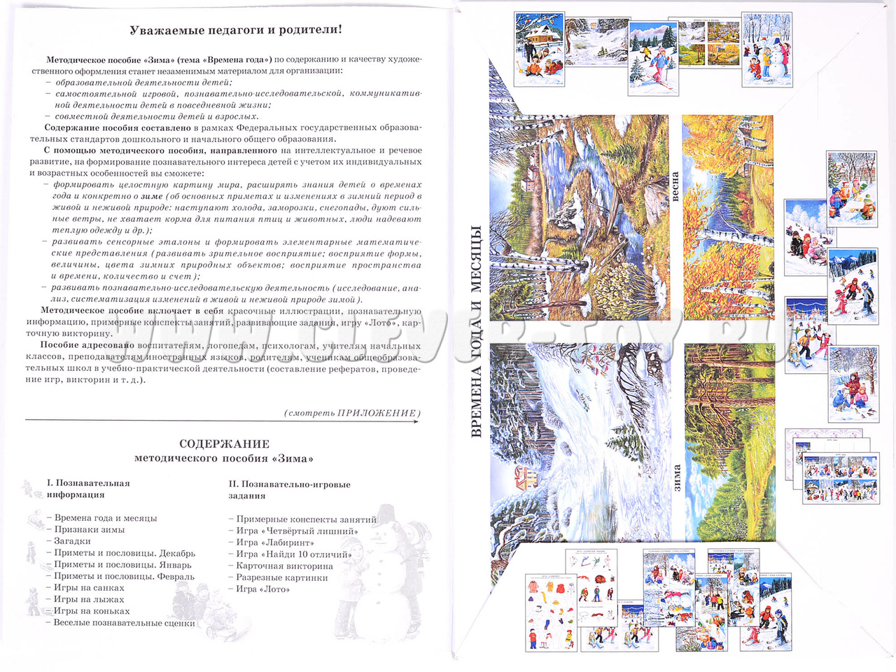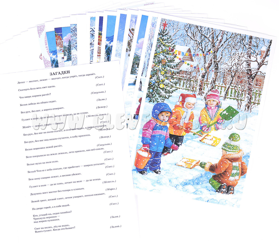 - 10 красочных иллюстраций на тему зимы, зимних игр и развлечений, познавательную информацию (названия месяцев, пословицы и поговорки и т.д.);