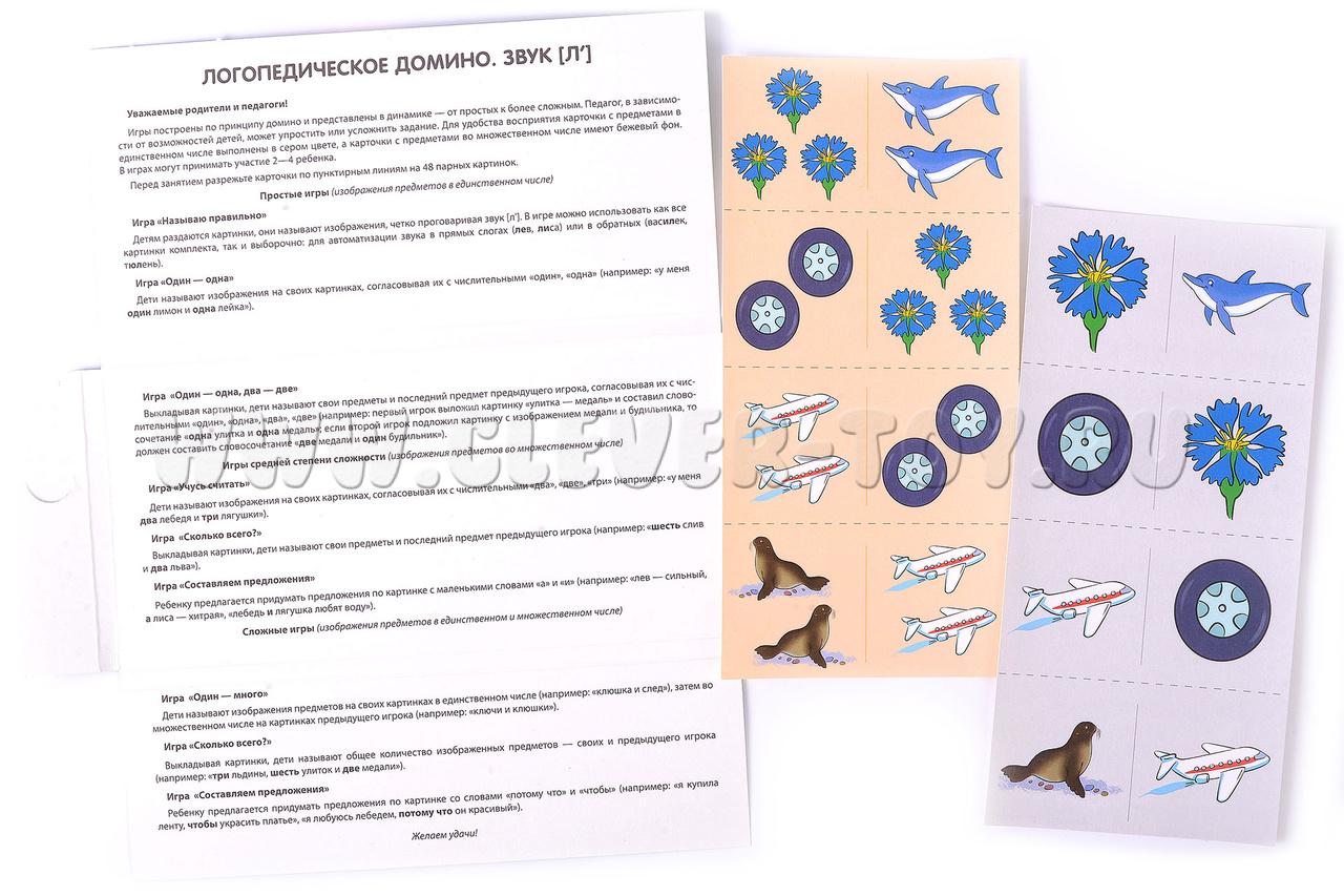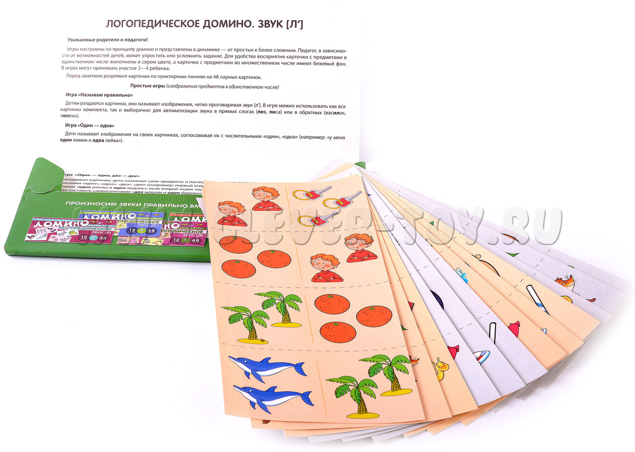 "Логопедическое домино" - это набор из 12 обучающих карточек с 48 парными картинками. В игровой форме дети учатся правильно произносить звук [л'], образовывать форму множественного числа существительных и согласовывать их с числительными и прилагательными.