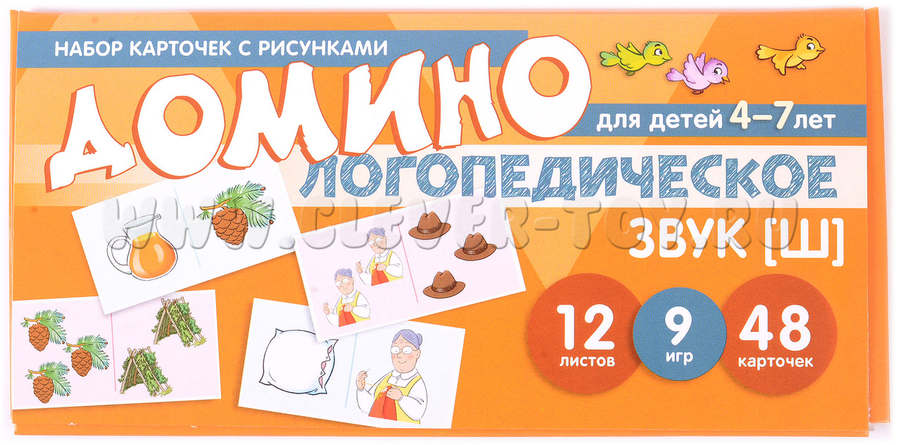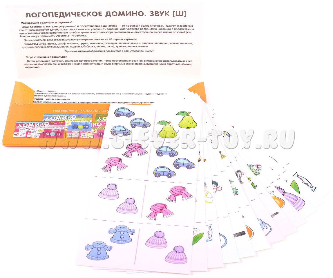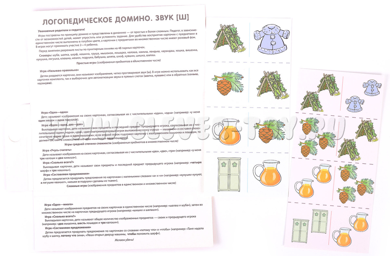 Учебно-игровой комплект "Логопедическое домино" представляет собой набор из 12 обучающих карточек, которые содержат 48 пар цветных картинок. В увлекательной игровой форме ребенок сможет освоить правильное произношение свистящего звука [Ш], а также научиться образовывать форму множественного числа существительных и согласовывать их с числительными и прилагательными.