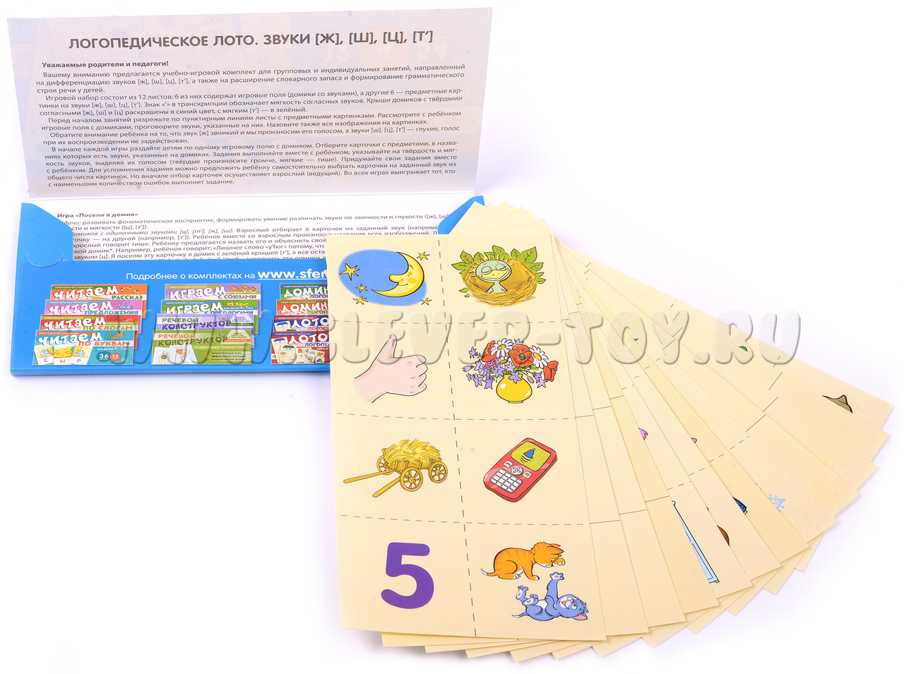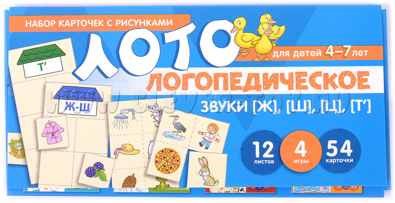 Комплект "Логопедическое лото. Учим звуки [Ж] [Ш] [Ц] [Т’]" представляет собой набор логопедических карточек, разработанных специально для дошкольников и младших школьников. Этот учебно-игровой комплекс состоит из 12 листов, на которых размещены 54 карточки и 6 заданий.