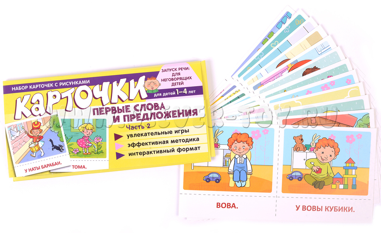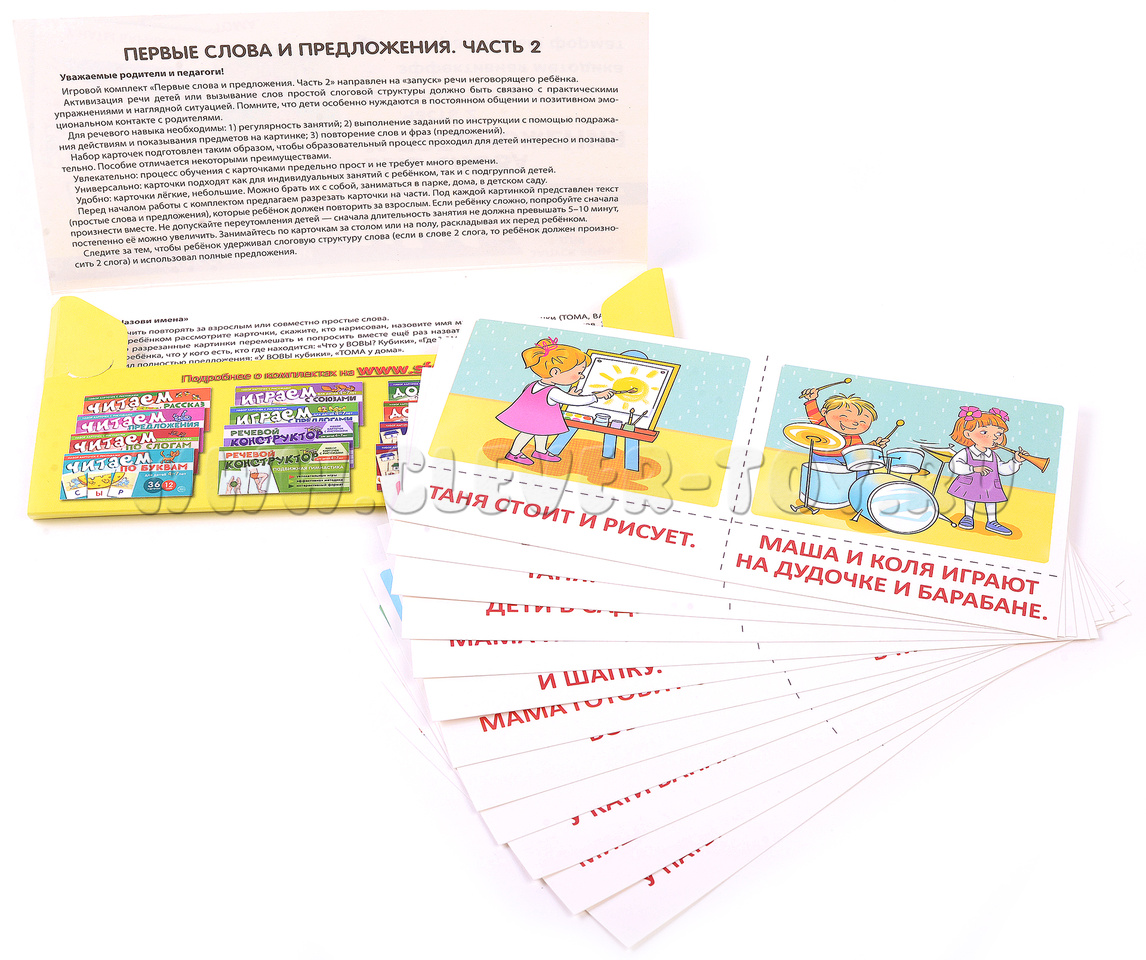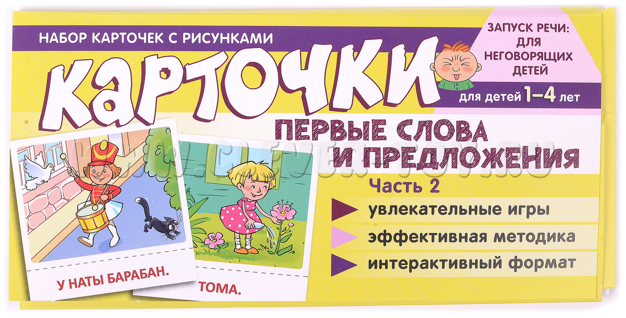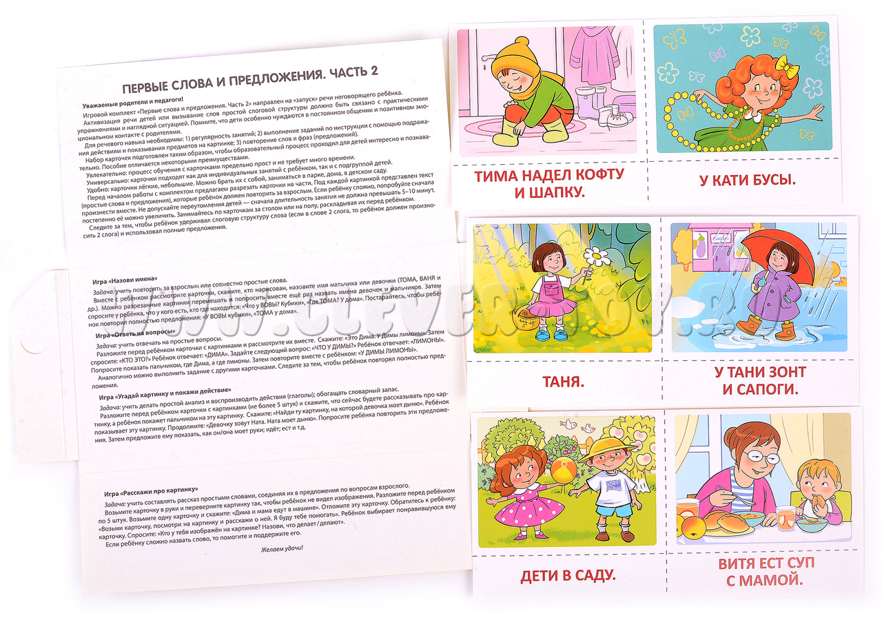Комплект "Первые слова и предложения. Часть 2" предназначен для развития речи у детей, которые ещё не умеют говорить.