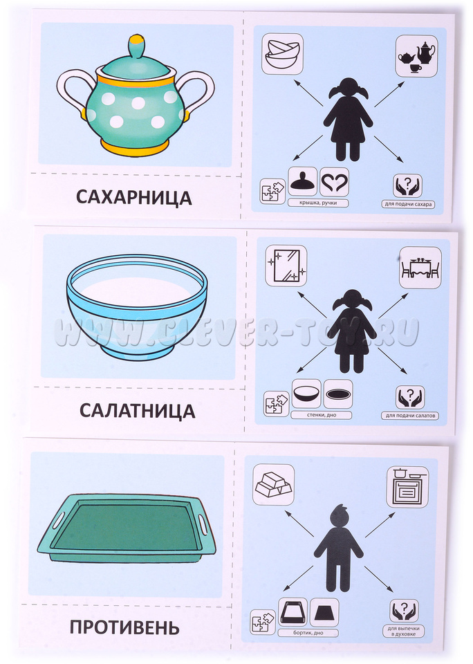 С помощью этого набора ребёнок сможет в игровой форме научиться определять характерные особенности разных видов посуды: кухонной, столовой и чайной. Он узнает, из каких частей состоит посуда, из какого материала она сделана и для чего предназначена. Также ребёнок научится составлять простые описательные загадки, делать выводы и умозаключения.
