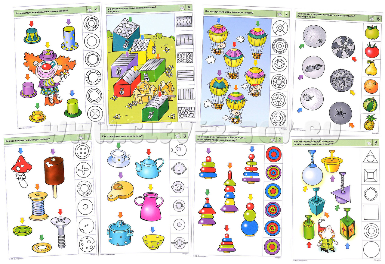 Задания комплекта направлены на развитие пространственного мышления, воображения и даже интуиции, ведь «геометрическое мышление» является образным, чувственным мышлением. Ребёнок научится угадывать, как будут выглядеть предметы с разных сторон, обратит внимание на то, что некоторые объёмные предметы сверху или сбоку похожи на плоские геометрические фигуры. Примеры заданий в карточках: 1а. Как эти предметы выглядят сверху? 2б. Какие игрушки видит обезьянка, а какие – ты? Почему вы видите по-разному? 4а. Как каждая шляпа клоуна выглядит сверху? 5б. Найди в этих узорах следы от колёс каждого транспортного средства. 7б. Какие машины гном увидел с воздушного шара?