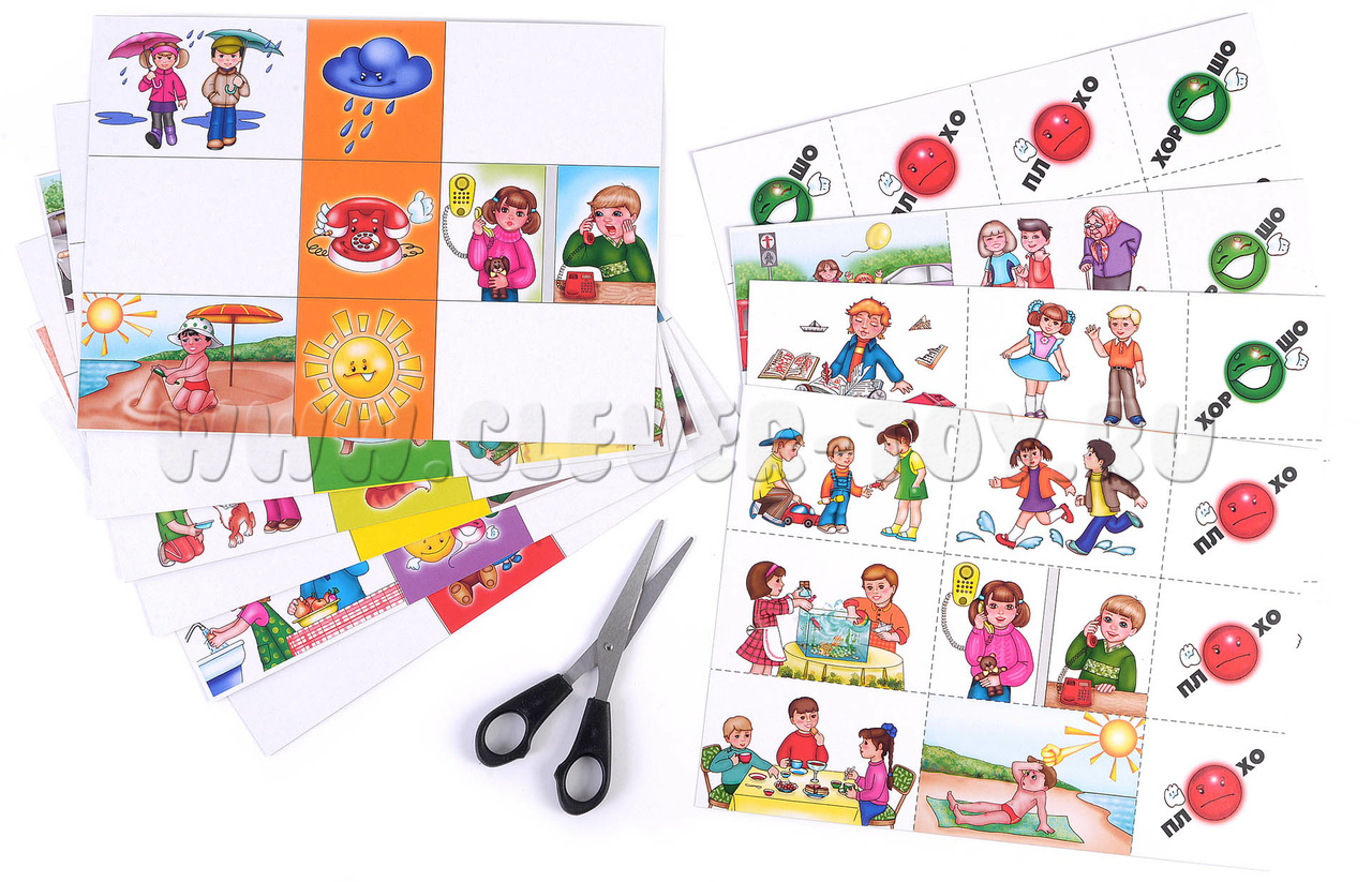 3 игра. Предлагаем разрезать большие карты на отдельные, и тогда в игре смогут участвовать все. Задача игроков — собрать вместе картинки ситуаций. Ведущий перемешивает маленькие карточки и раздает их всем. Затем ведущий показывает игрокам отдельные карточки-картинки. Если изображение содержит тему маленькой карточки, то игрок берет ее себе. Так нужно собрать положительные и отрицательные картинки. Выигрывает тот, кто соберет свои ситуации первым.