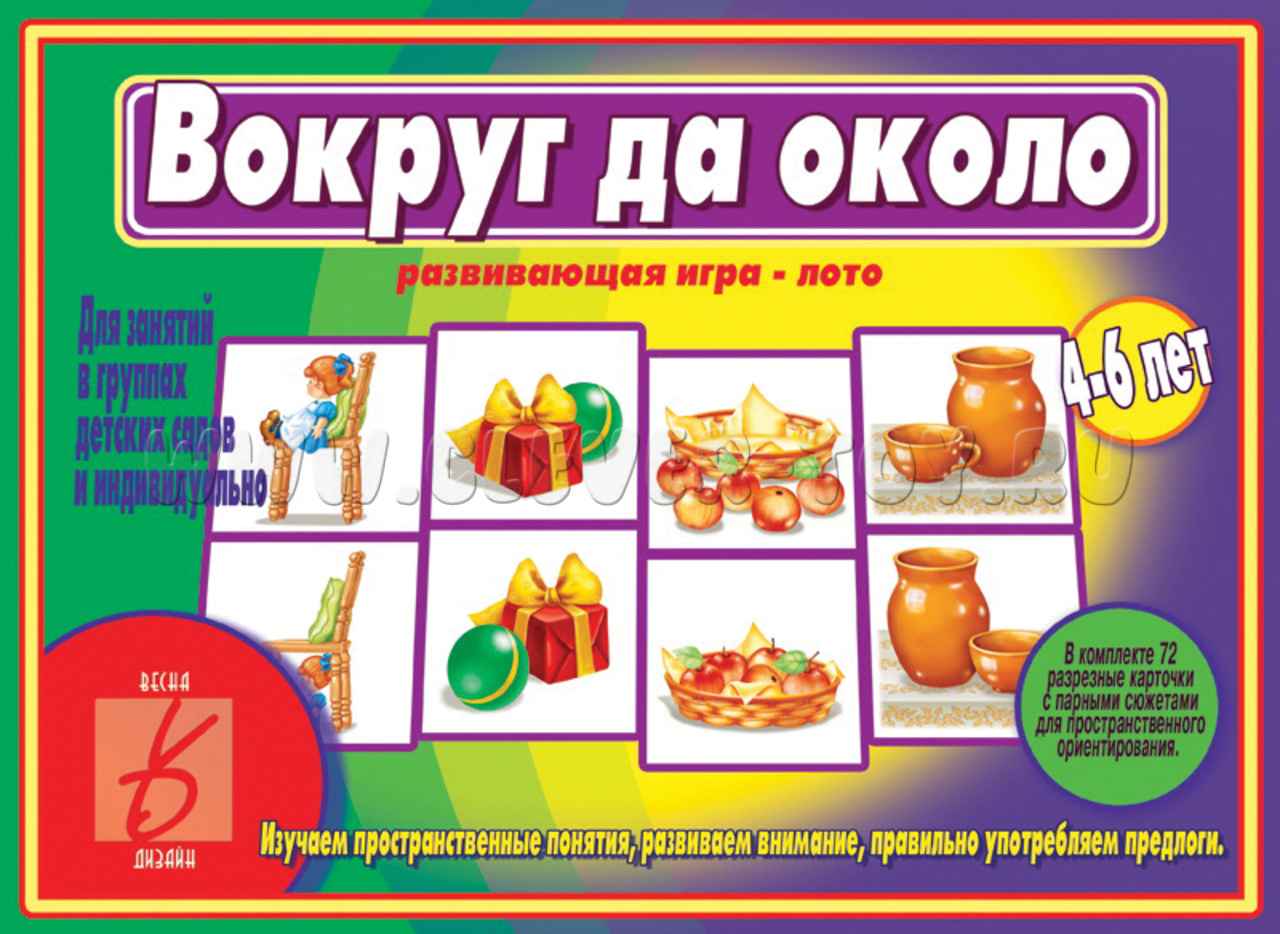 "Вокруг да около" – развивающая игра-лото, адресованная родителям и педагогам специально для занятий с детьми дошкольного (от 4 до 6 лет) возраста. Эта игра станет незаменимым помощником в развитии пространственного восприятия и освоении пространственных понятий, а также развитии умения использовать предлоги.