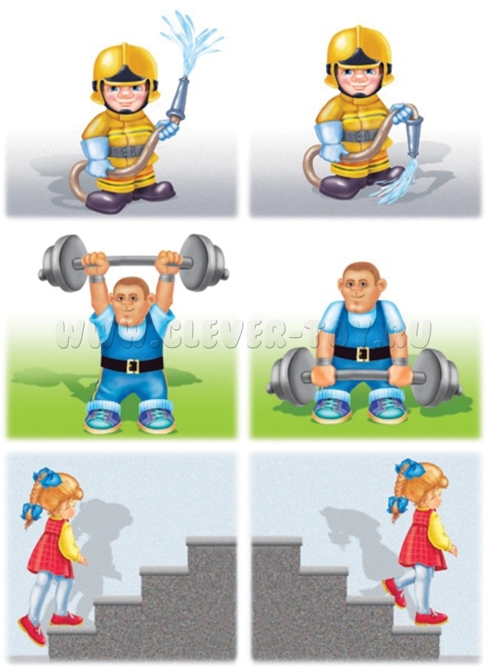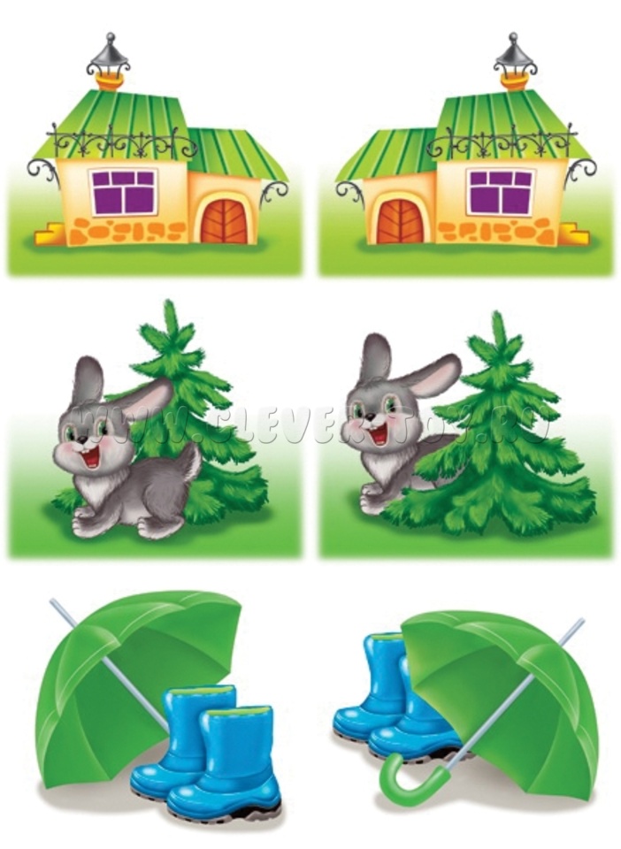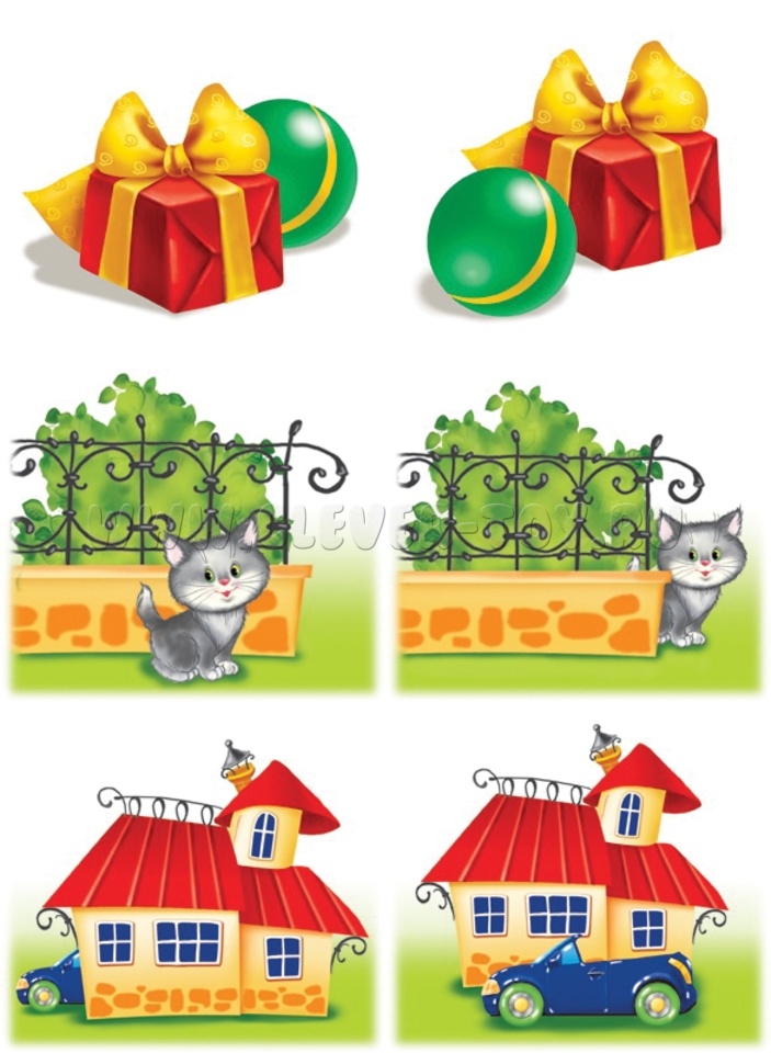 - Предложите ребенку или группе детей разобрать карточки по парам. Объясните, чем отличаются друг от друга картинки, используя в речи пространственные понятия и предлоги;