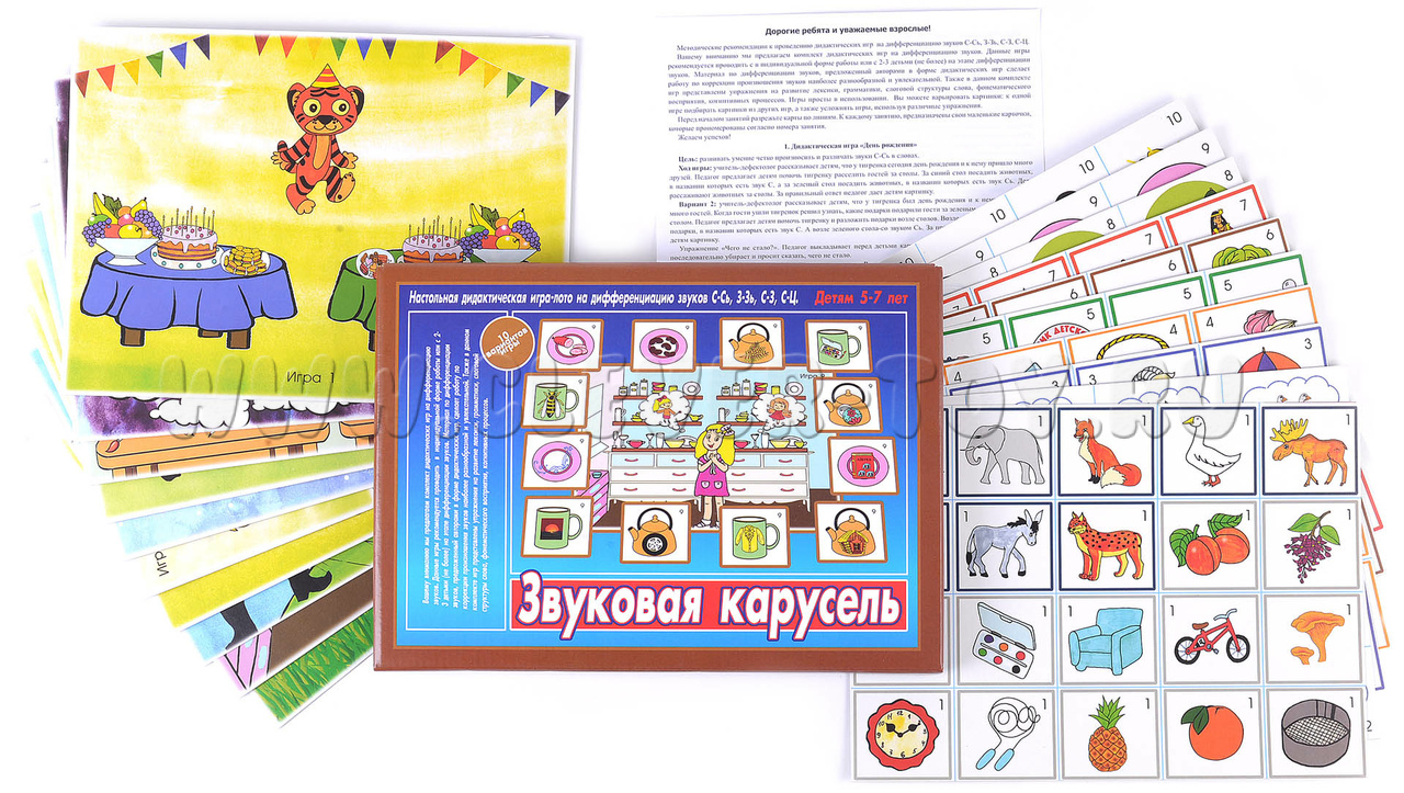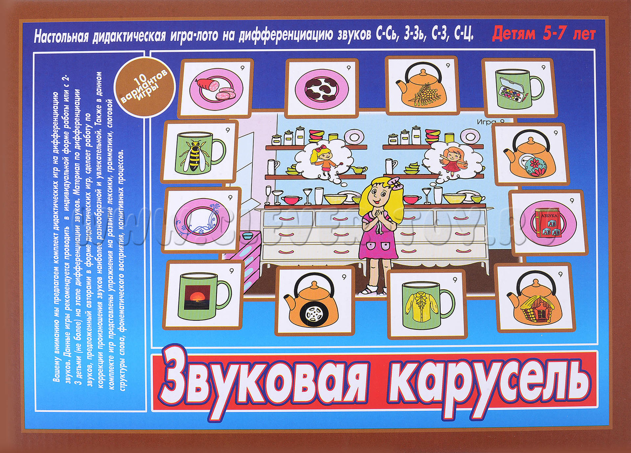 Дидактическая игра-лото на дифференциацию звуков С-Сь, З-Зь, С-З, С-Ц для детей 5-7 лет. В комплекте из 10 игр упражнения по дифференциации звуков, задания на развитие грамматики, лексики, слоговой структуры слова, фонематического восприятия, когнитивных процессов.