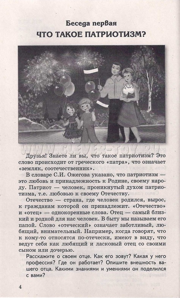 Книга посвящена нравственно-патриотическому воспитанию детей, построена в виде бесед, из которых дети узнают о том, что такое патриотизм, Отечество, Отчизна, малая родина, а также о государственных символах России, ее природе, важных исторических событиях, выдающихся людях, прославивших нашу страну, народных традициях и обрядах.