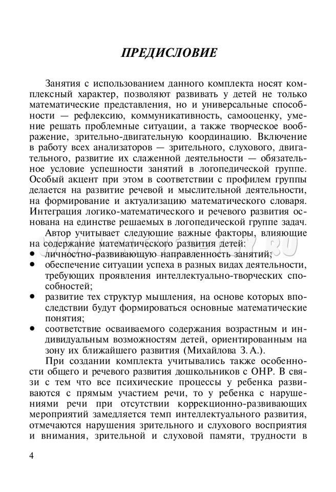 Пособие "Развитие математических представлений у дошкольников с ОНР ( с 4 до 5 и с 5 до 6 лет)" рекомендовано к использованию в дошкольных образовательных учреждениях. В пособии представлены конспекты занятий воспитателя по развитию математических представлений у дошкольников среднего и старшего дошкольного возраста.