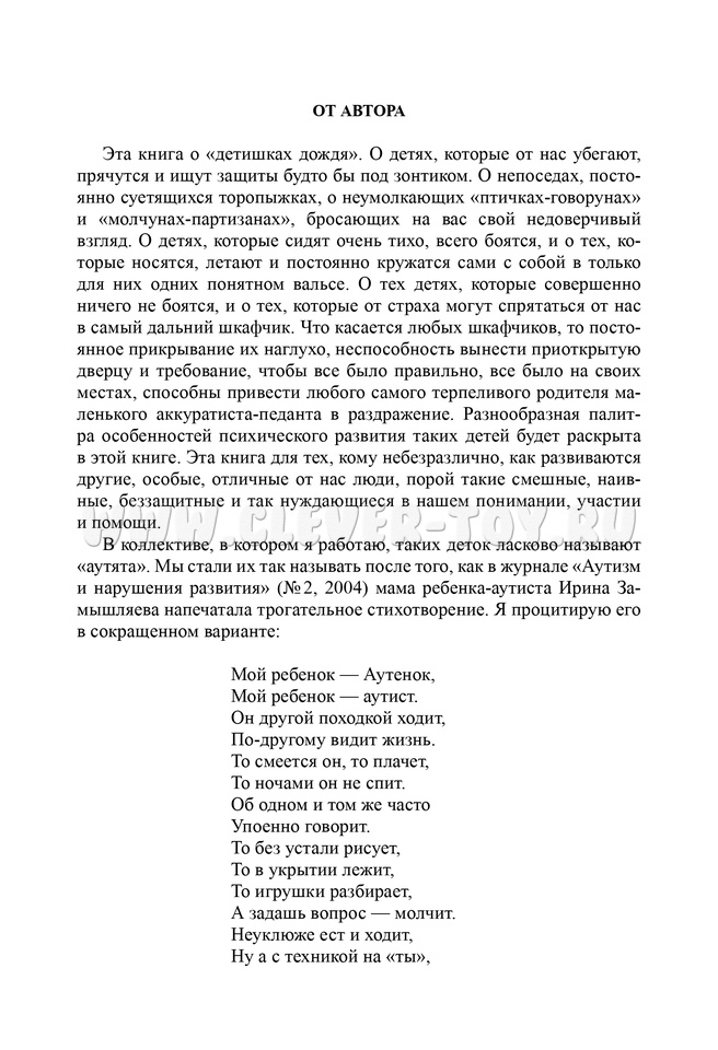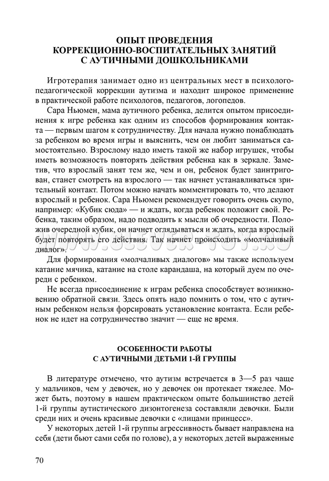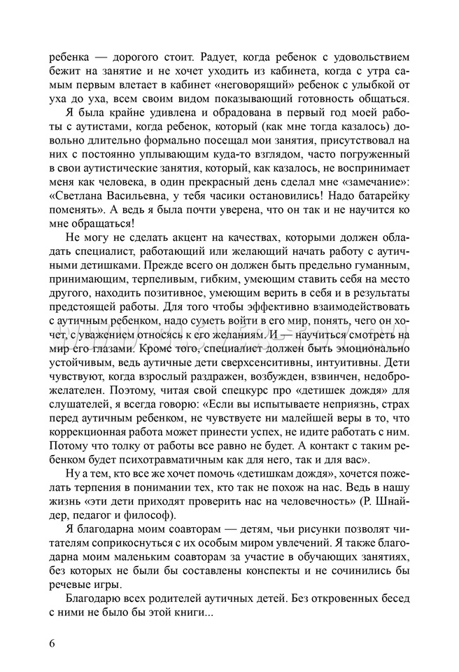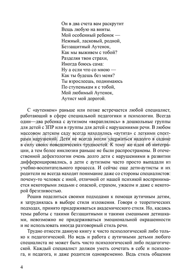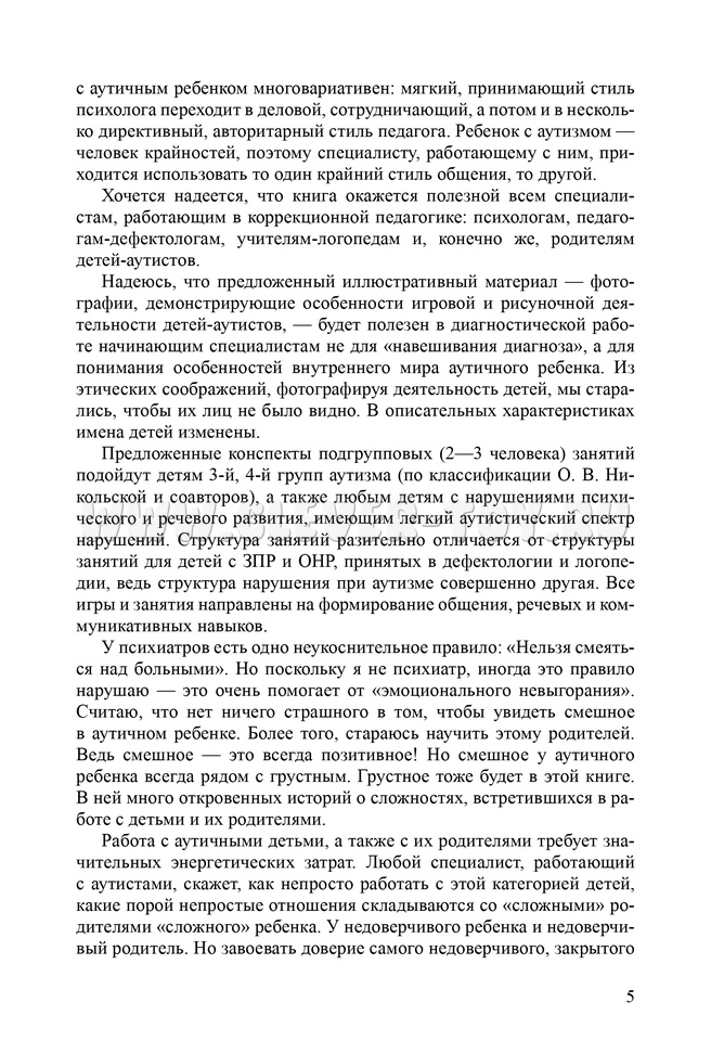 Практический материал может быть использован специалистами (психологами, педагогами-дефектологами, учителями-логопедами) как в коррекционной работе с аутичными дошкольниками (3-й, 4-й групп), так и с детьми, имеющими нарушения психического, речевого развития и эмоциональной сферы. Книга будет полезной родителям детей- аутистов.