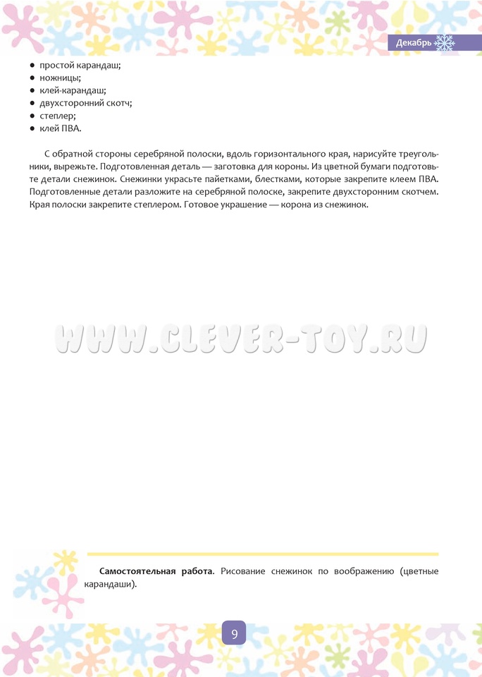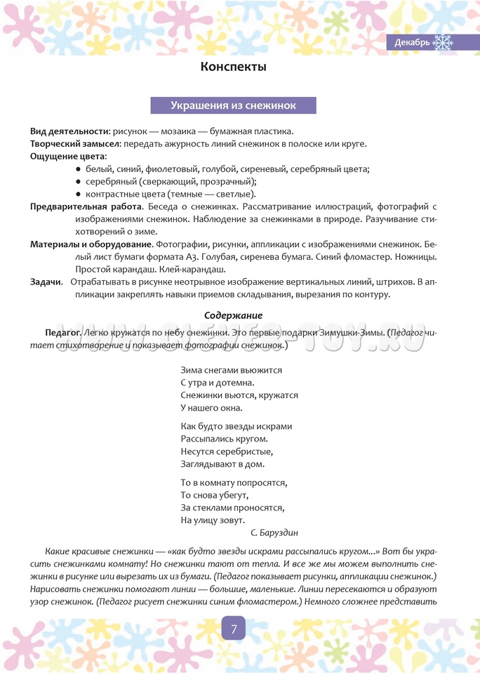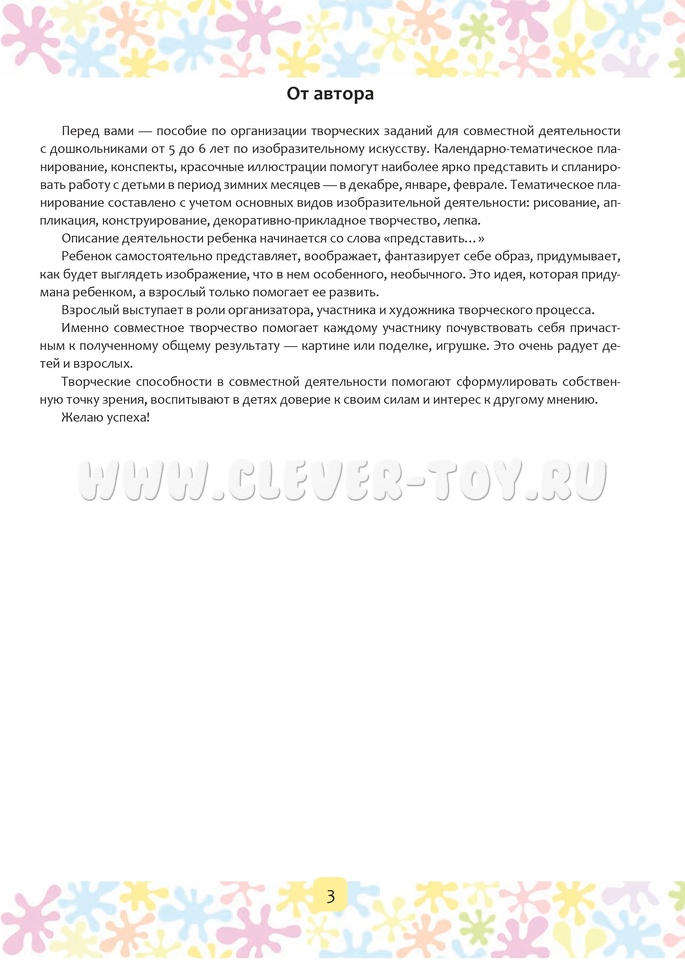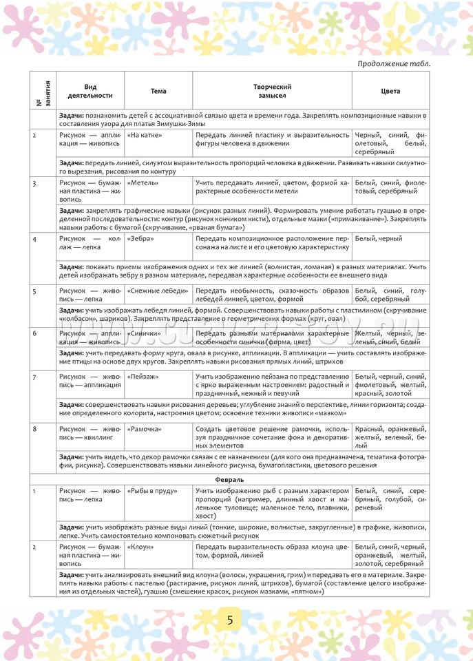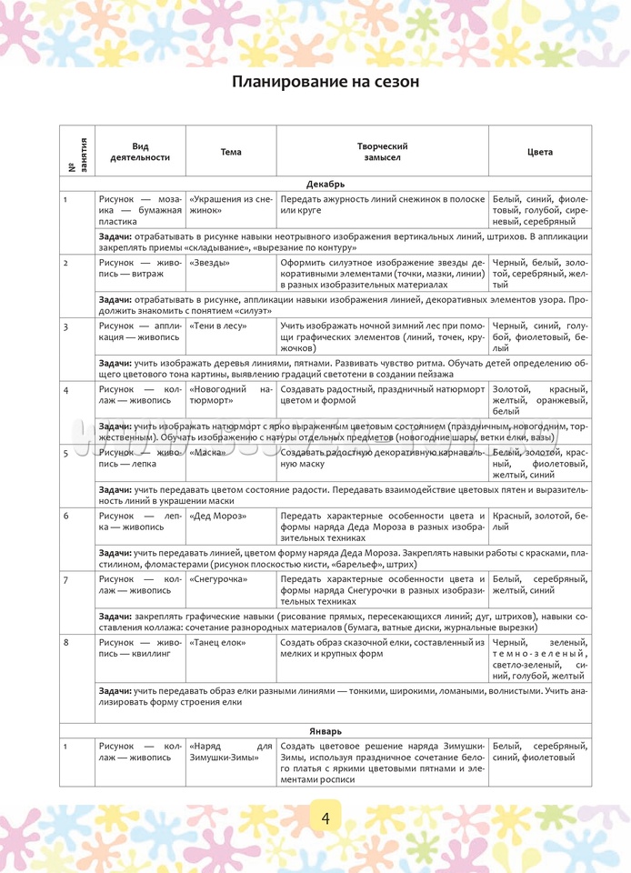 Перед вами руководство по разработке творческих заданий для совместных занятий с дошкольниками в возрасте от 5 до 6 лет, посвящённых изобразительному искусству. Календарный план, конспекты и яркие иллюстрации помогут вам наглядно представить и организовать работу с детьми в течение зимних месяцев — декабря, января и февраля. План занятий разработан с учётом основных видов изобразительной деятельности: рисования, аппликации, конструирования, декоративно-прикладного искусства и лепки.