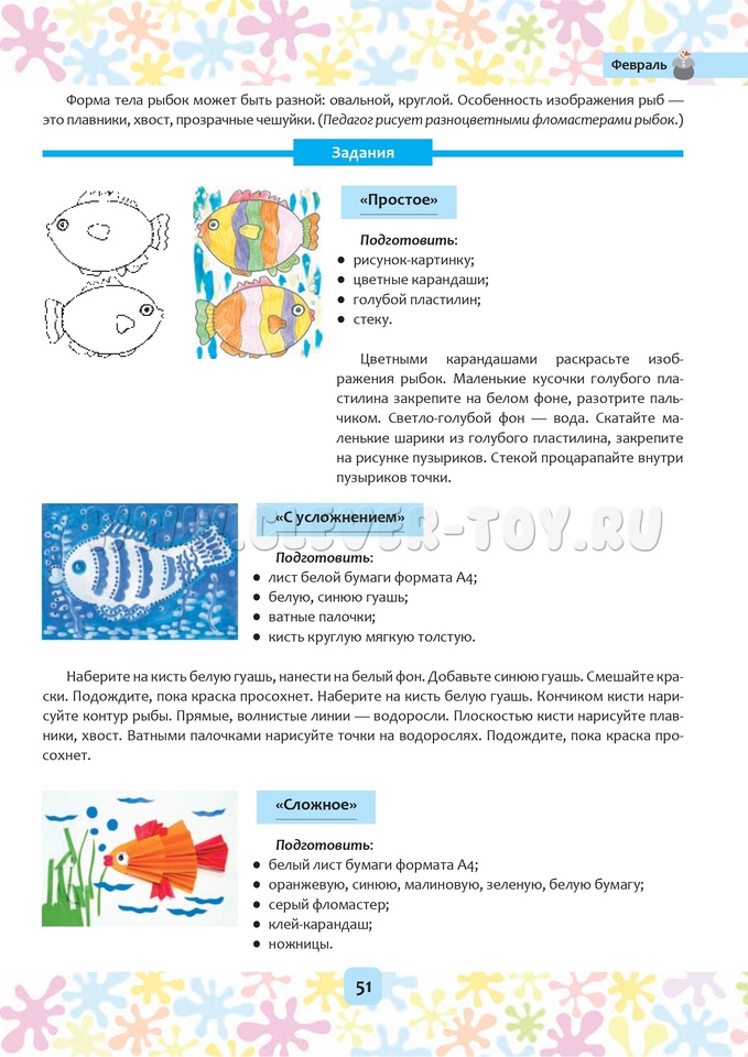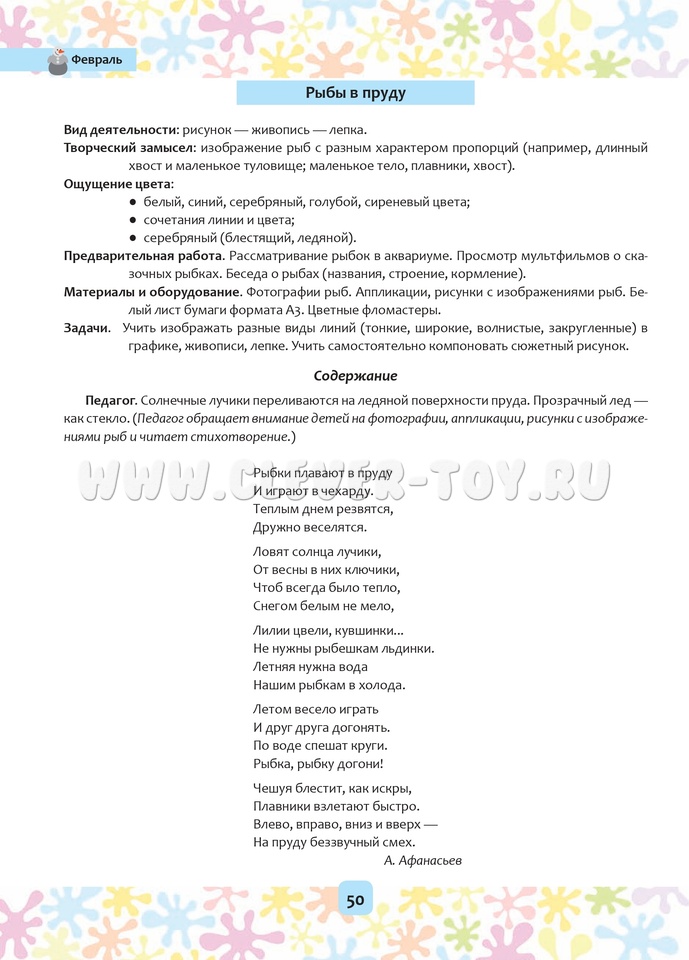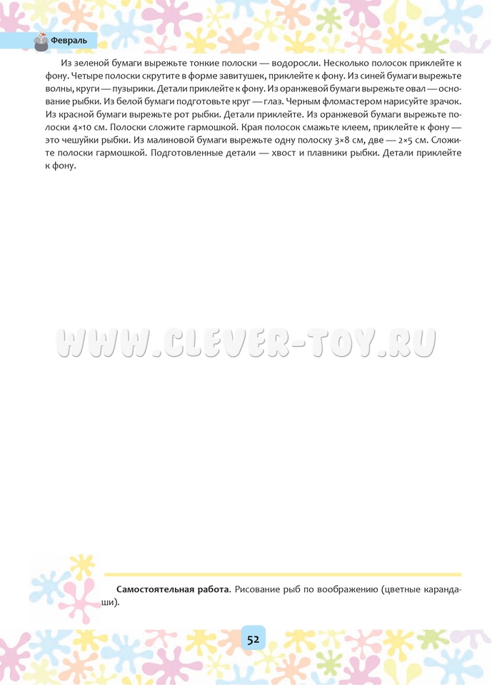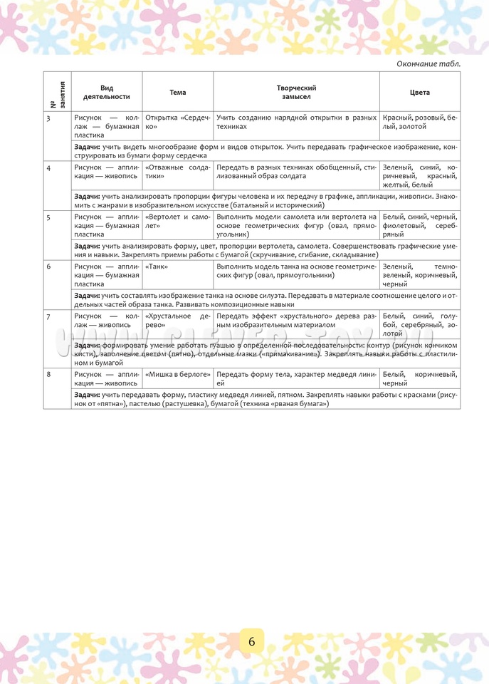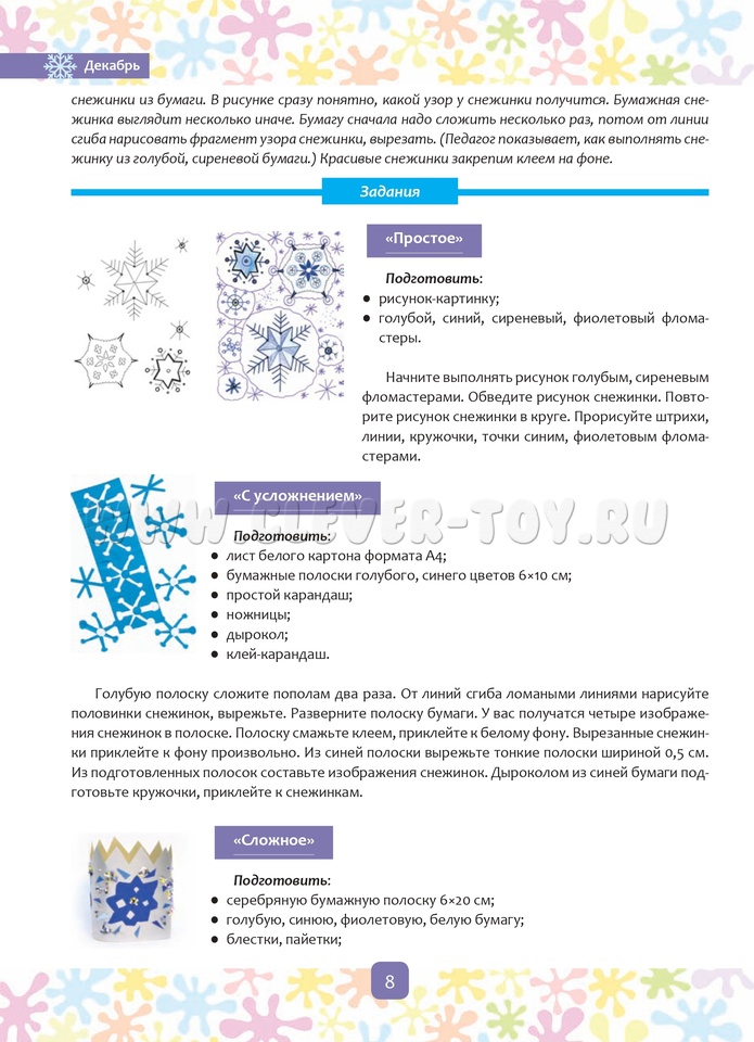 Перед вами руководство по разработке творческих заданий для совместных занятий с дошкольниками в возрасте от 5 до 6 лет, посвящённых изобразительному искусству. Календарный план, конспекты и яркие иллюстрации помогут вам наглядно представить и организовать работу с детьми в течение зимних месяцев — декабря, января и февраля. План занятий разработан с учётом основных видов изобразительной деятельности: рисования, аппликации, конструирования, декоративно-прикладного искусства и лепки.