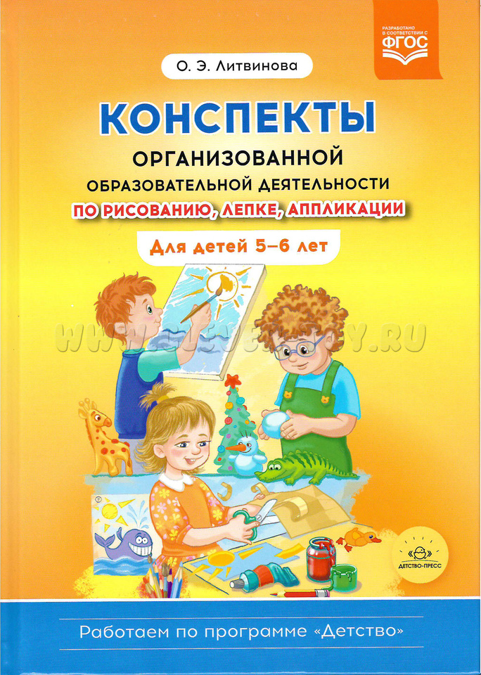 "Конспекты организованной образовательной деятельности по рисованию, лепке, аппликации (для детей 5-6 лет)" составлены по комплексной образовательной программе дошкольного образования «Детство».