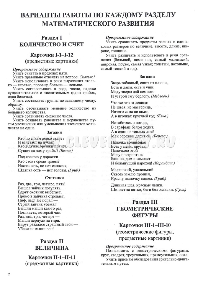 Представлены следующие разделы: количество и счет, геометрические фигуры, величина, ориентировка во времени, ориентировка в пространстве, логические задачи, развитие внимания.