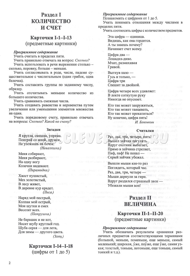 Представлены разделы: количество и счёт, геометрические фигуры, величина, ориентировка во времени, ориентировка в пространстве, логические задачи, развитие внимания.