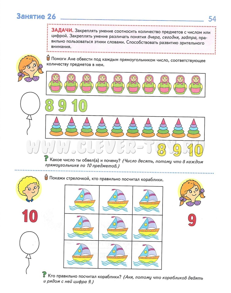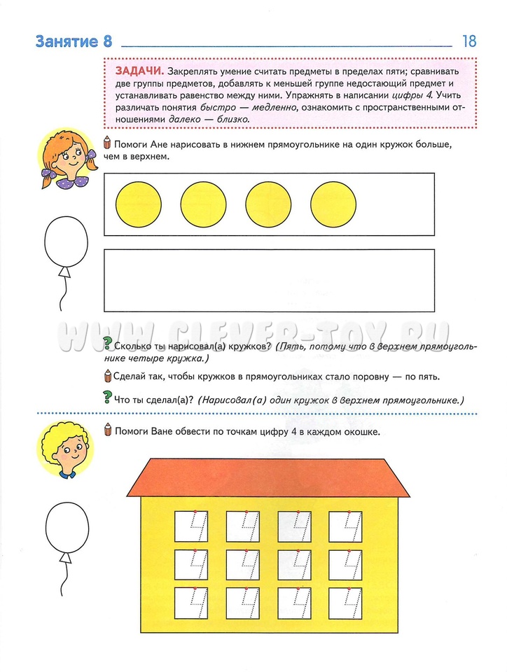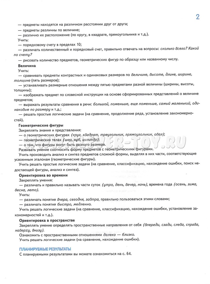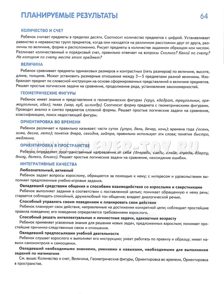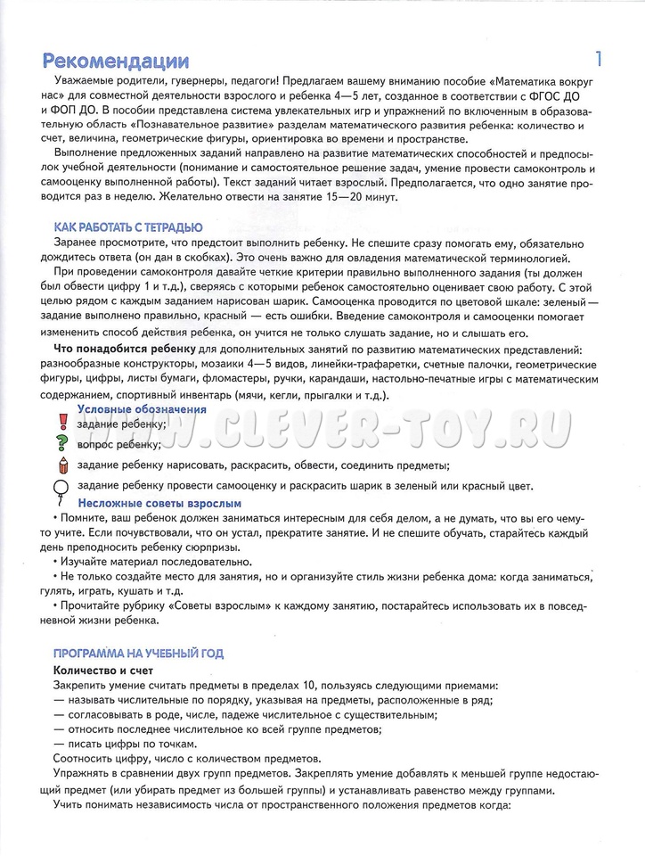 В рубрике "Советы взрослым" предлагаются задания для закрепления математических представлений в повседневной жизни ребёнка: на прогулке, в играх, во время еды и т.д. Пособие также содержит программные задачи и планируемые результаты.