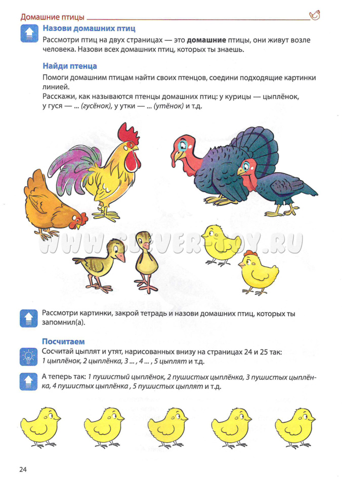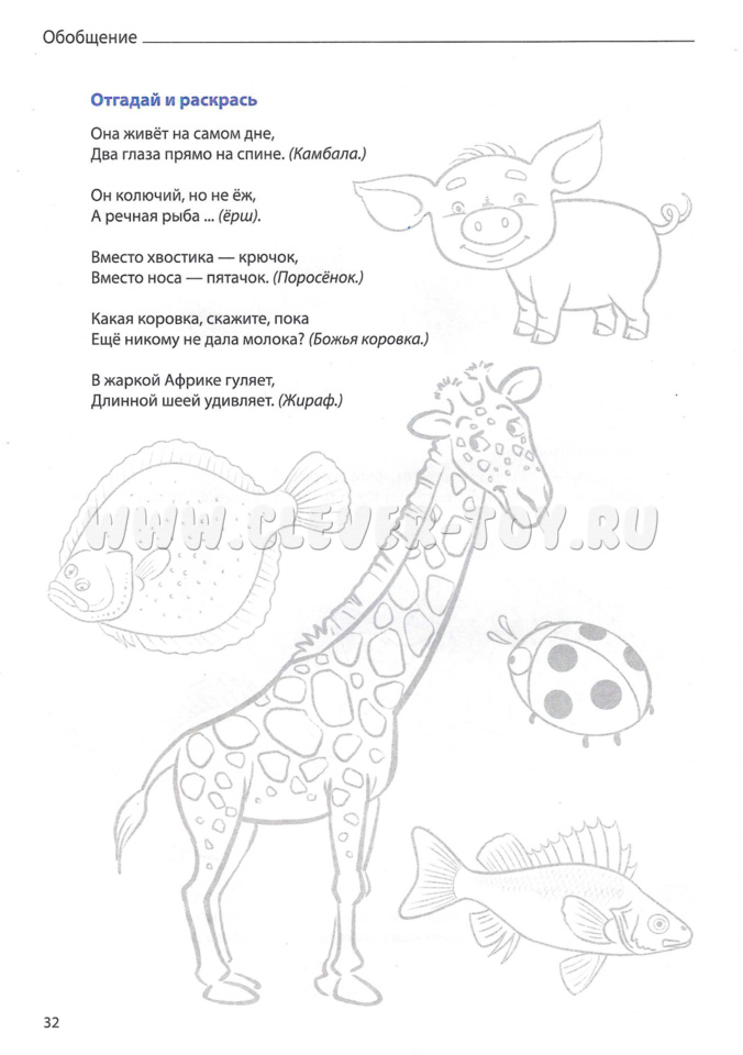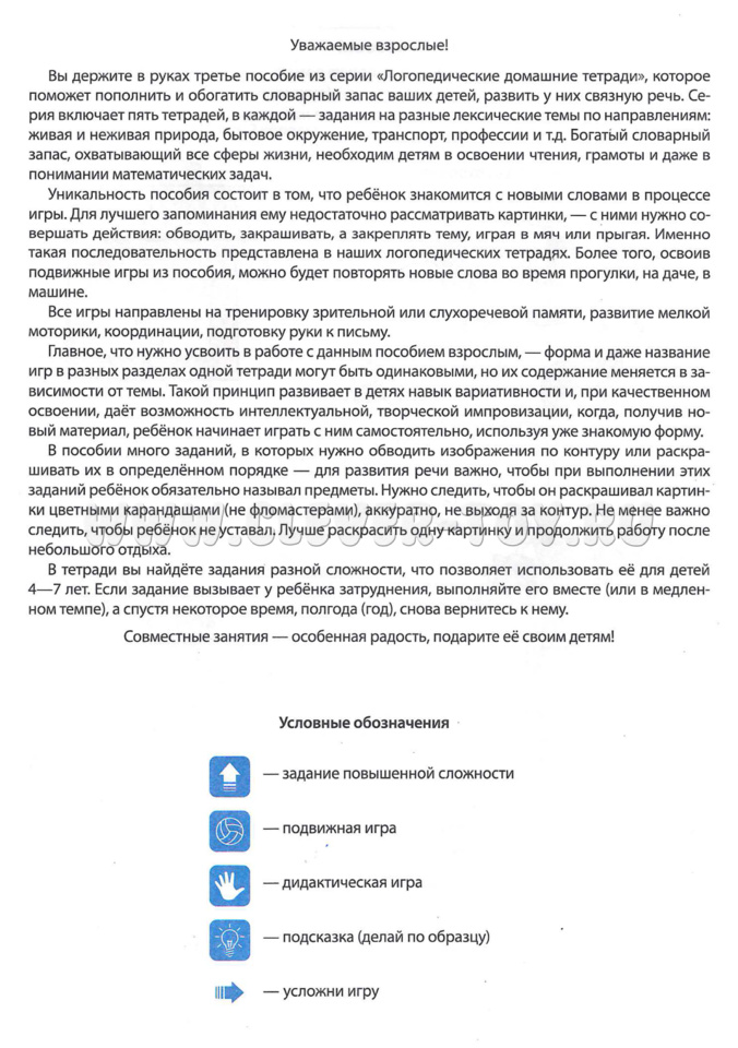 В пособии много заданий, в которых нужно обводить изображения по контуру или раскрашивать их в определённом порядке - для развития речи важно, чтобы при выполнении этих заданий ребёнок обязательно называл предметы. В тетради вы найдёте задания разной сложности, что позволяет использовать её для детей 4-7 лет.