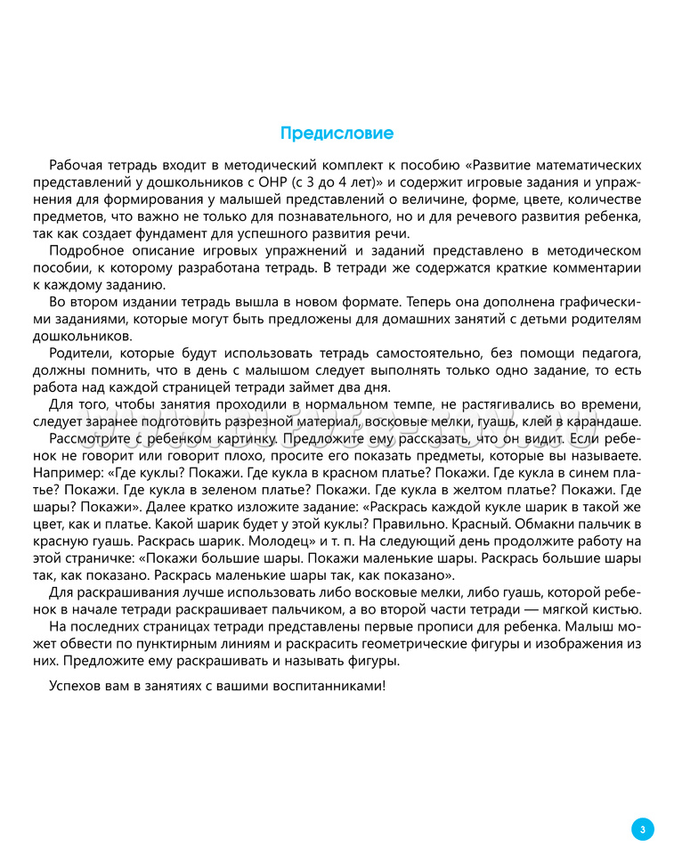 Рабочая тетрадь входит в методический комплект к пособию Н. В. Нищевой "Развитие математических представлений у дошкольников с ОНР (с 3 до 4 лет)" и содержит игровые задания и упражнения для формирования у малышей представлений о величине, форме, цвете, количестве предметов, что важно не только для познавательного, но и для речевого развития ребенка, так как создает фундамент для развития речи.