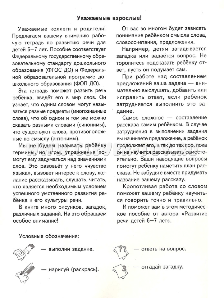 Рабочая тетрадь посвящена вопросам развития речи детей дошкольного возраста старшей и подготовительной к школе групп. Предлагаются методические рекомендации по организации образовательной деятельности. Рассмотрены возрастные особенности развития речи детей 6-7 лет.