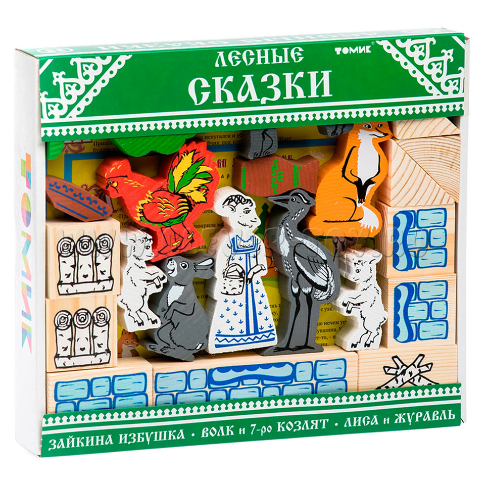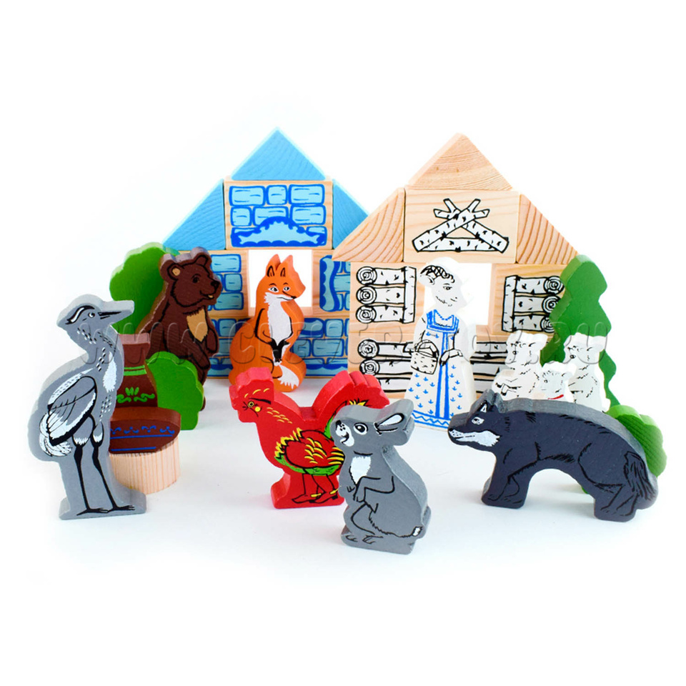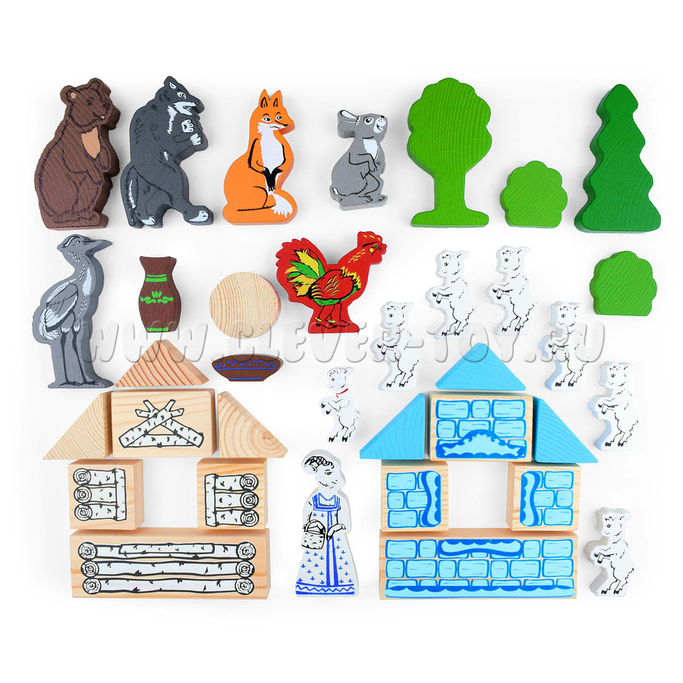 В набор входят деревянные модели персонажей и декорации 3 сказок ("Волк и семеро козлят", "Зайкина избушка", "Лиса и журавль"), а также вкладыш с текстами сказок.