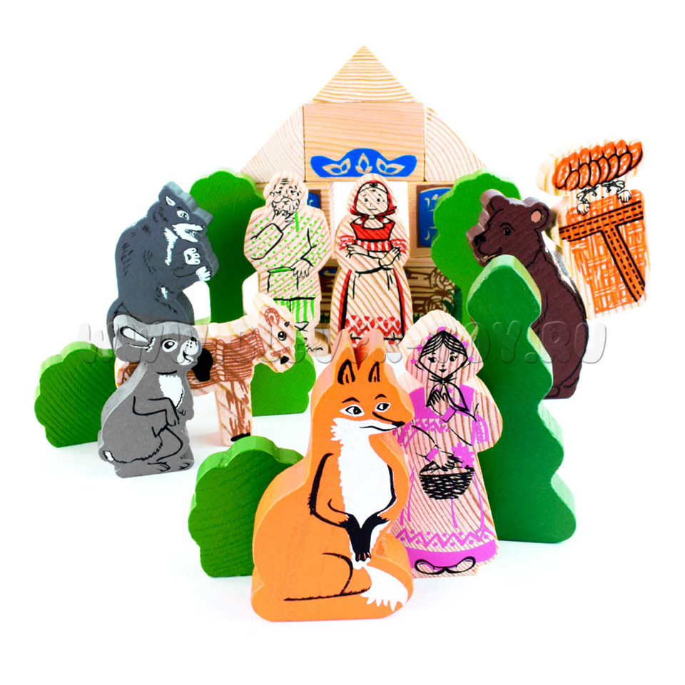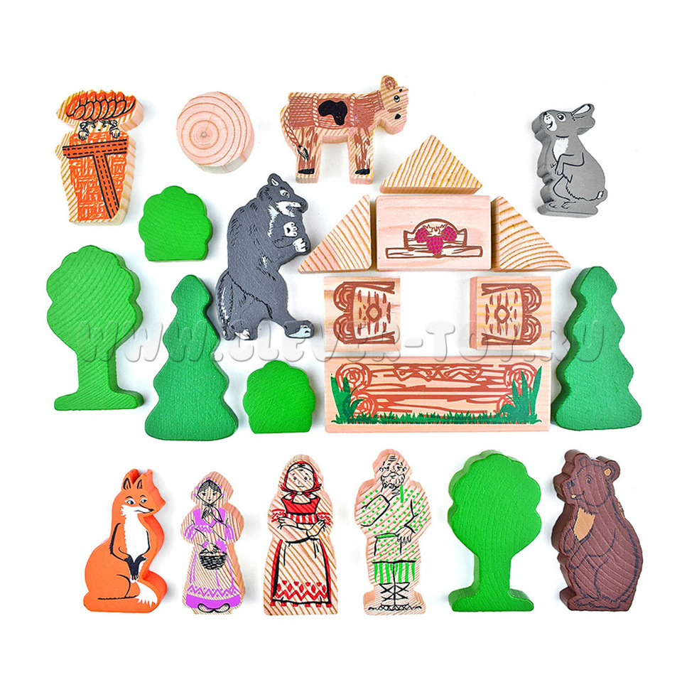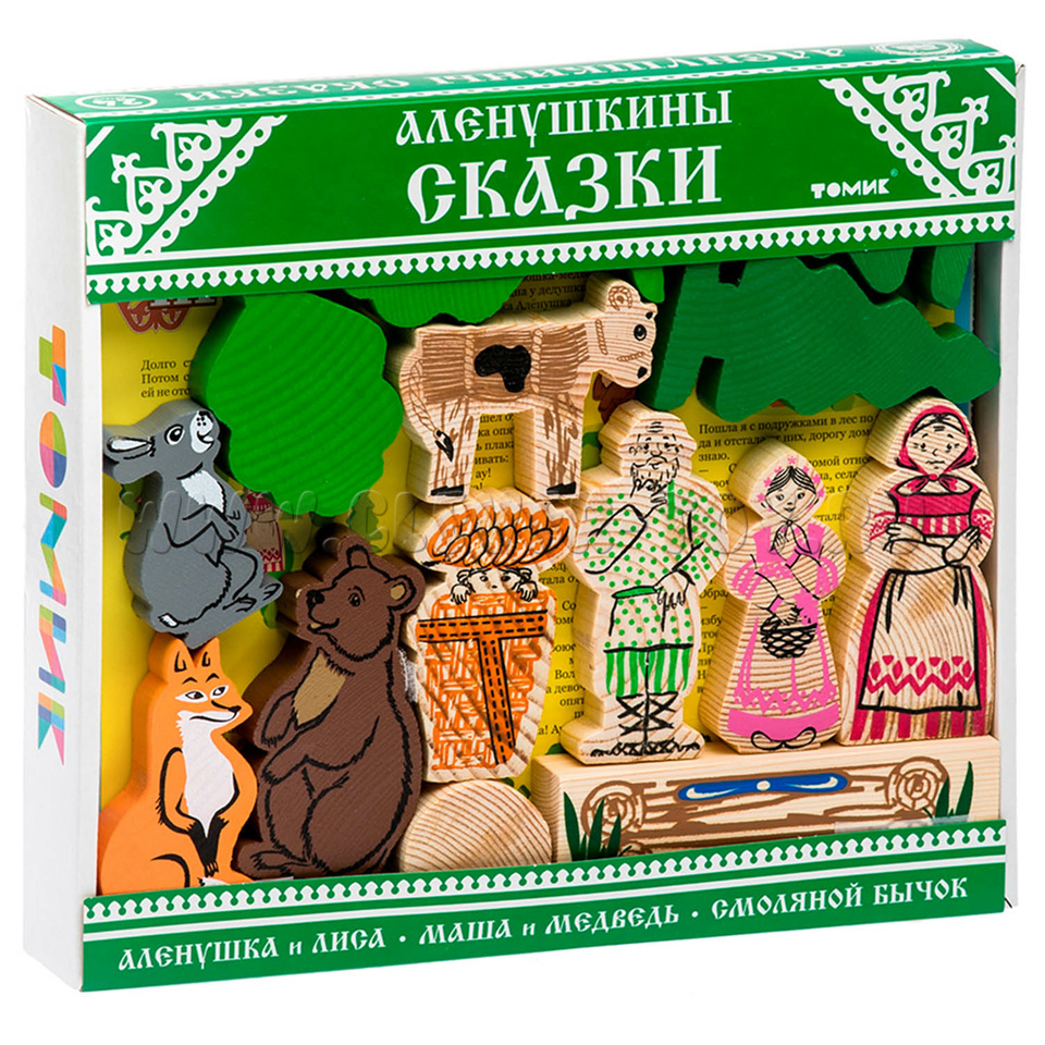 В набор входят деревянные модели персонажей и декорации "Аленушкиных сказок" ("Маша и медведь", "Смоляной бычок", "Аленушка и Лиса"), а также вкладыш с текстами сказок.