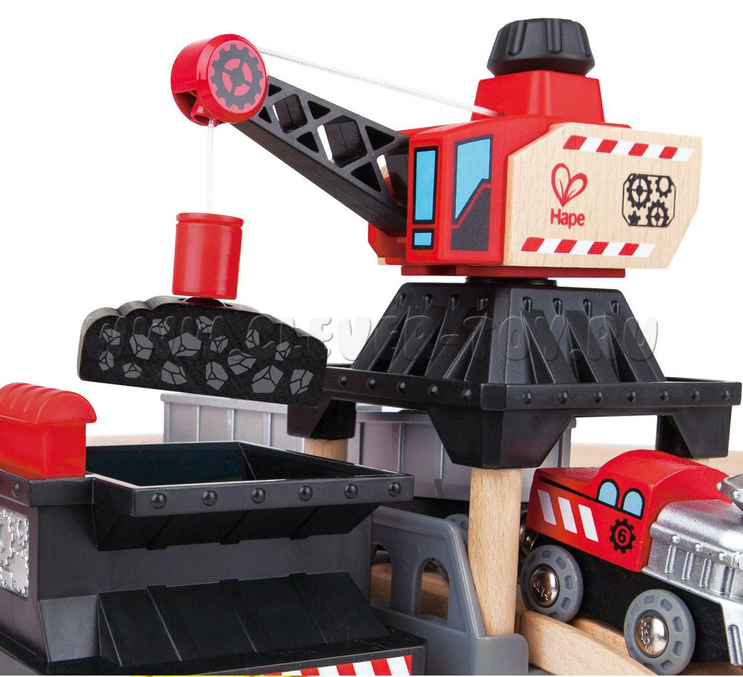 Деревянный комплект включает в себя кран с магнитным подъемником для перемещения груза на поезд и обратно.