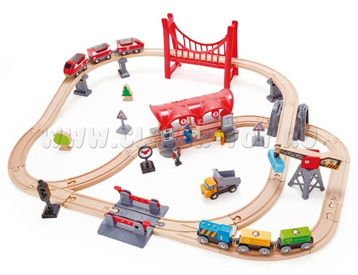 В набор входят фигурки пассажира с сумкой и железнодорожника с сигналом.
