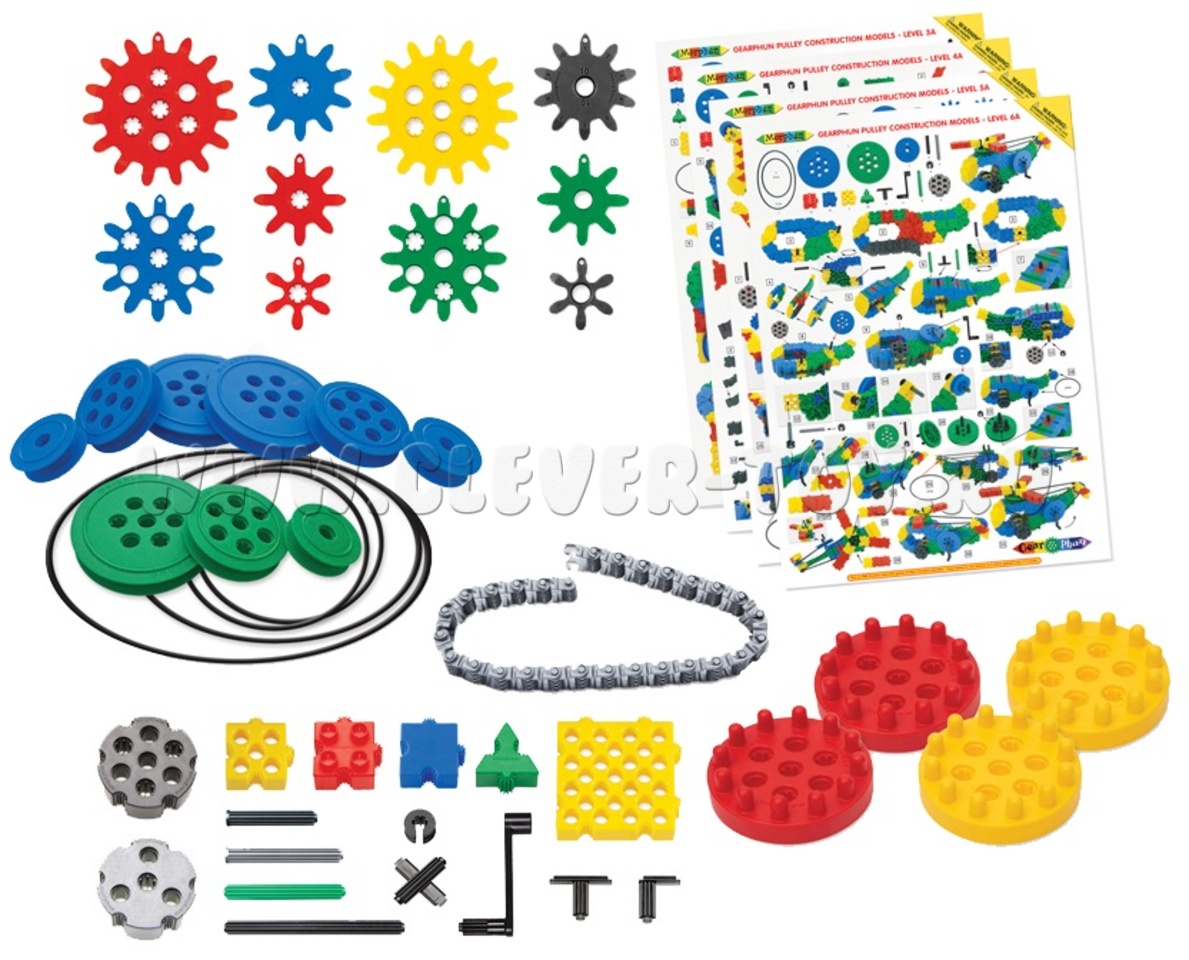 В состав комплекта включены шестерени 5-и разных размеров, цевочные колеса, наборы для сборки реечной, цепной и ременной передачи, разноцветные детали 10 разных конфигураций, валы, фиксаторы, соединительные элементы разной формы, рукояти для вращения.