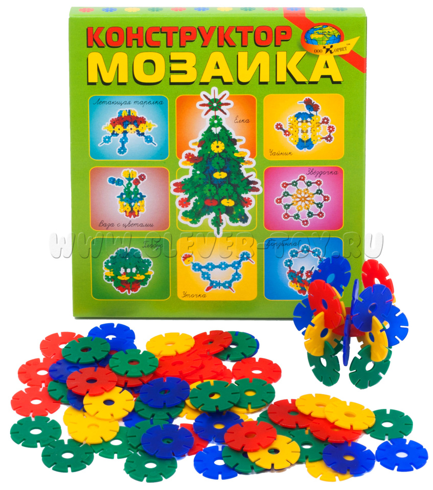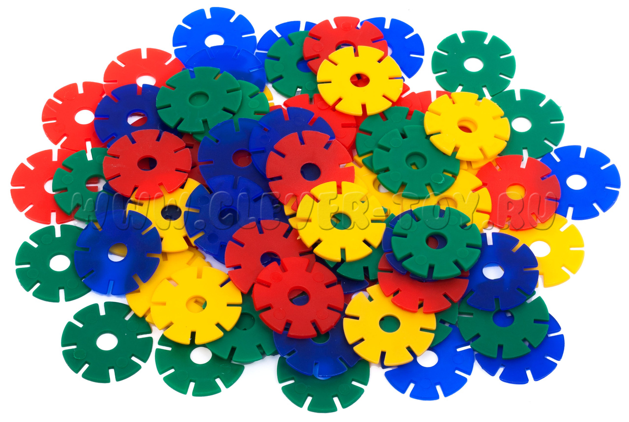 Состоит из круглых плоских фигур с прорезями для соединения. Фигуры четырех цветов в количестве 80 шт. По 20 каждого цвета.