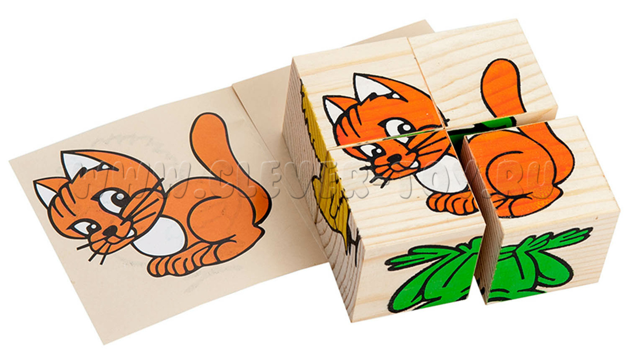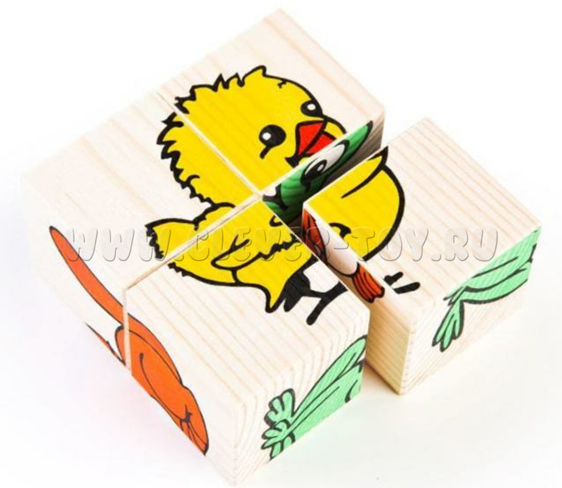 В состав входит четыре кубика, из которых ребенок может собрать 6 картинок животных.