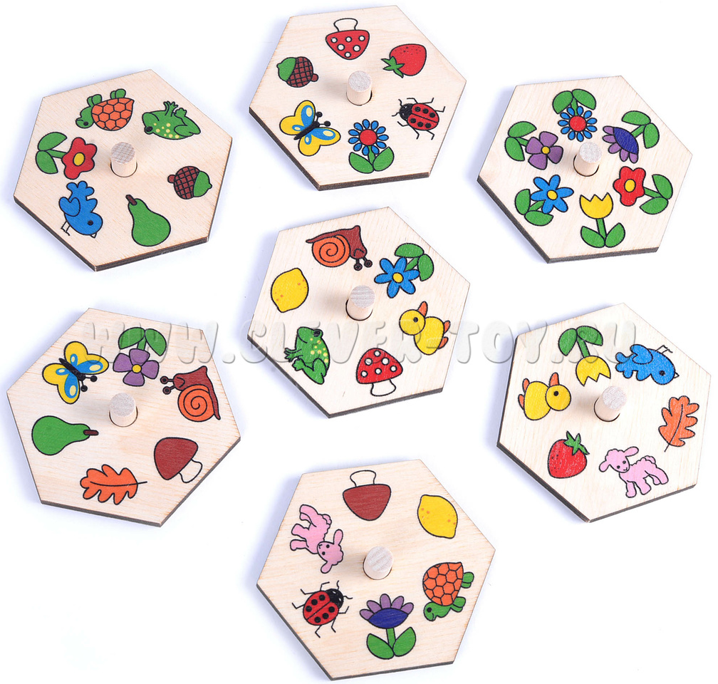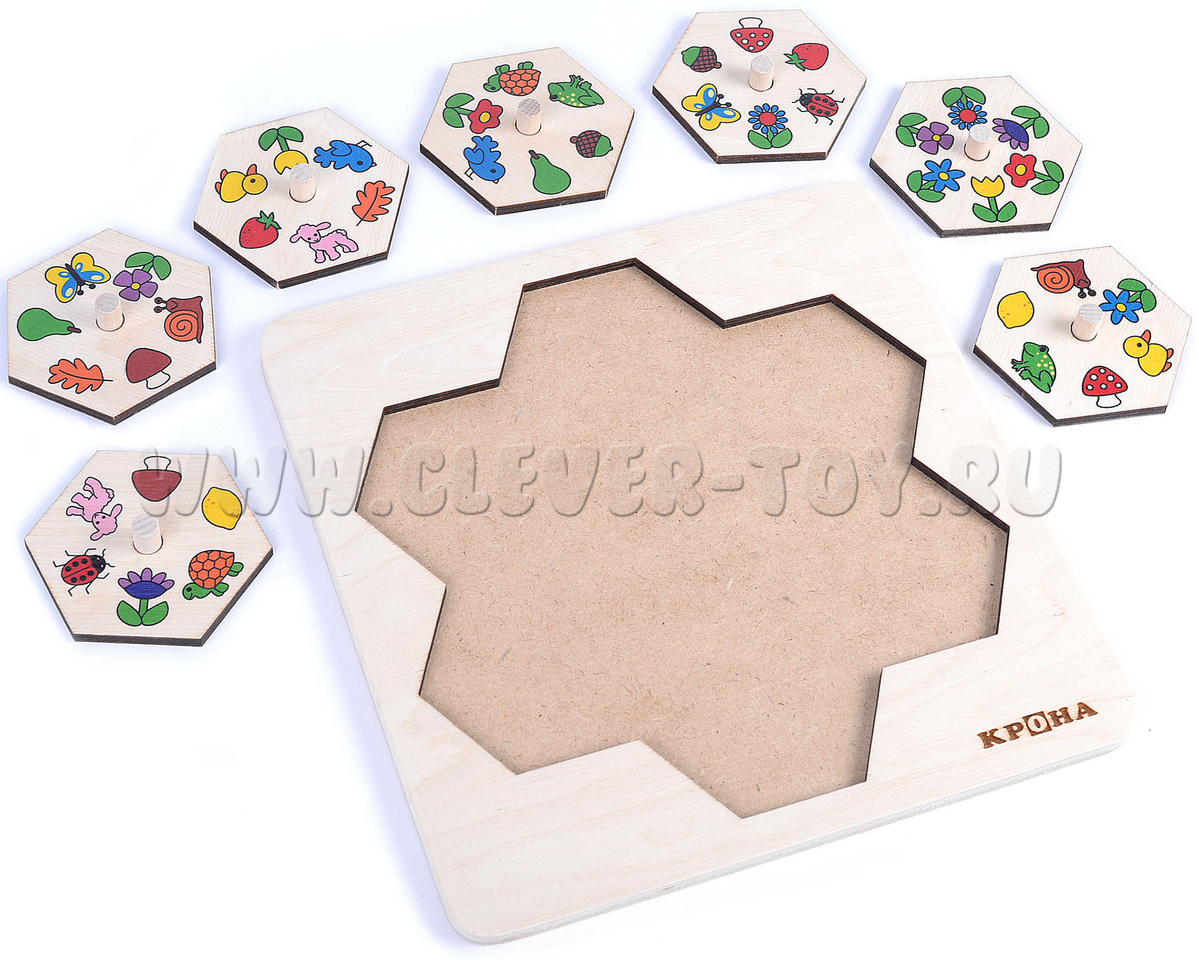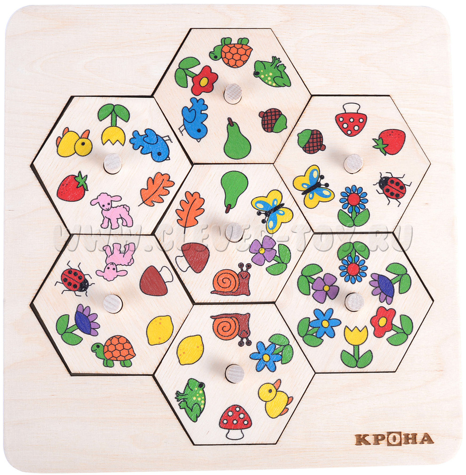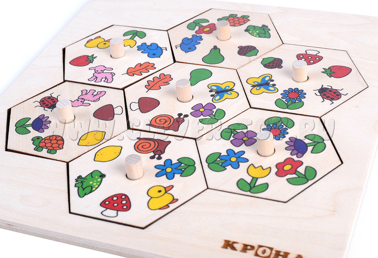- Семи деталей-шестиугольников (вкладываются в рамку, составные) размером 72*62 мм с изображениями (животных,растений).