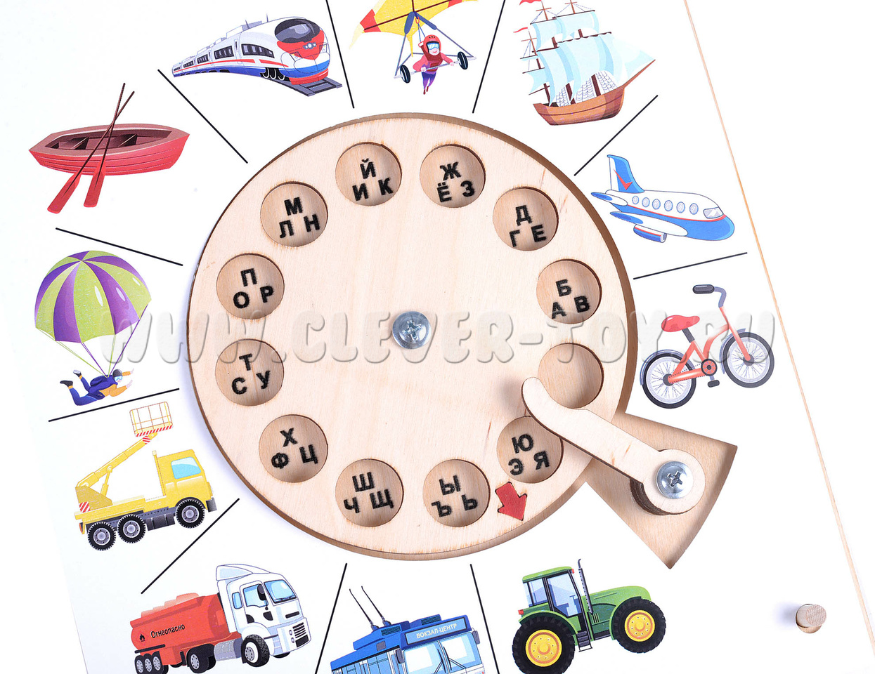 Игра состоит из 5 карт с картинками. На планшете закреплен вращающийся диск с буквами, на него устанавливается карточка. В игре может принимать любое количество детей.