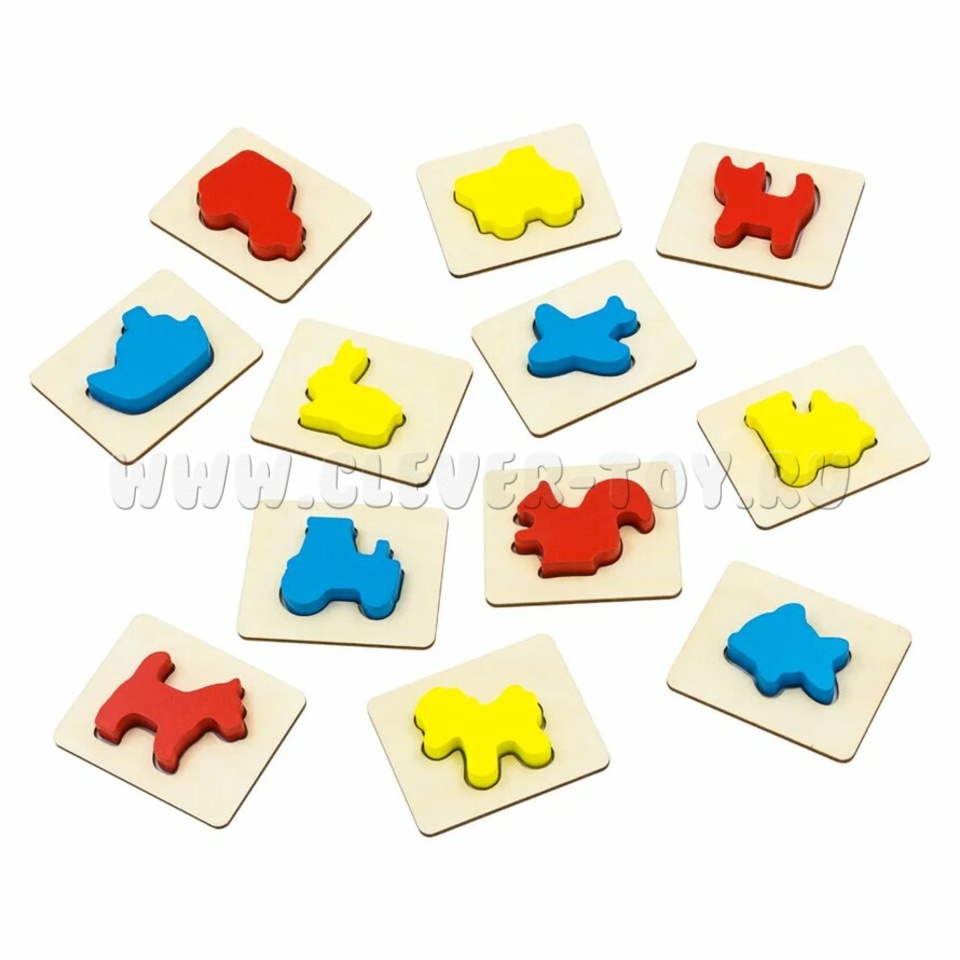- 12 объемных цветных фигурок с животными и видами транспорта,