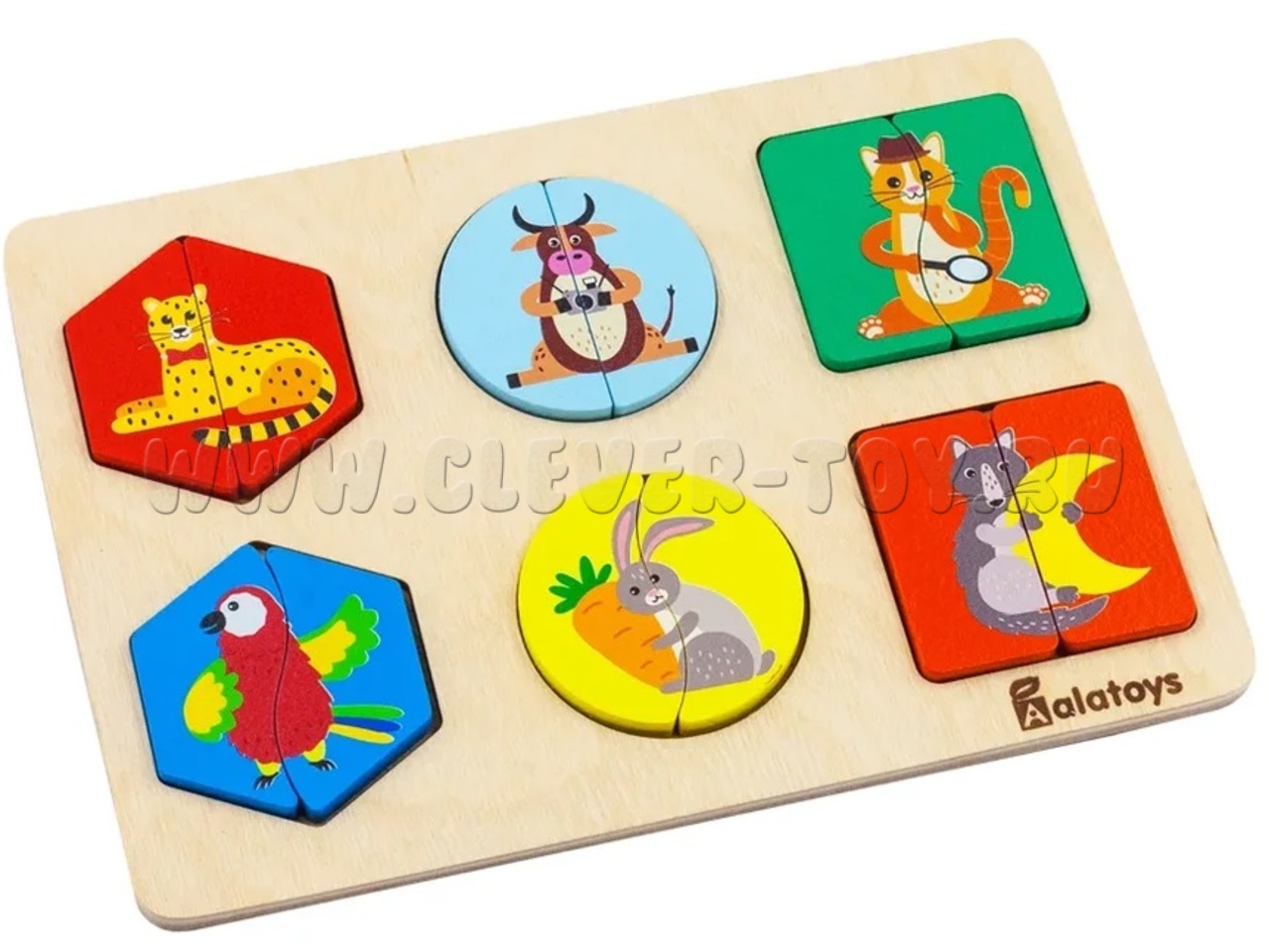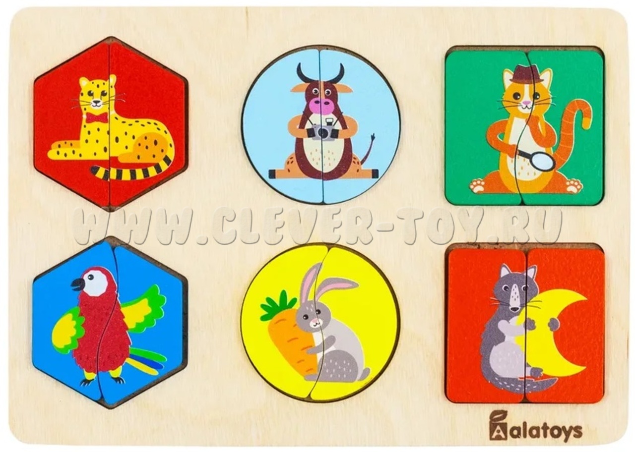 Сортер-пазл с изображениями животных состоит из 6 ярких двусоставных деревянных картинок разных геометрических форм.