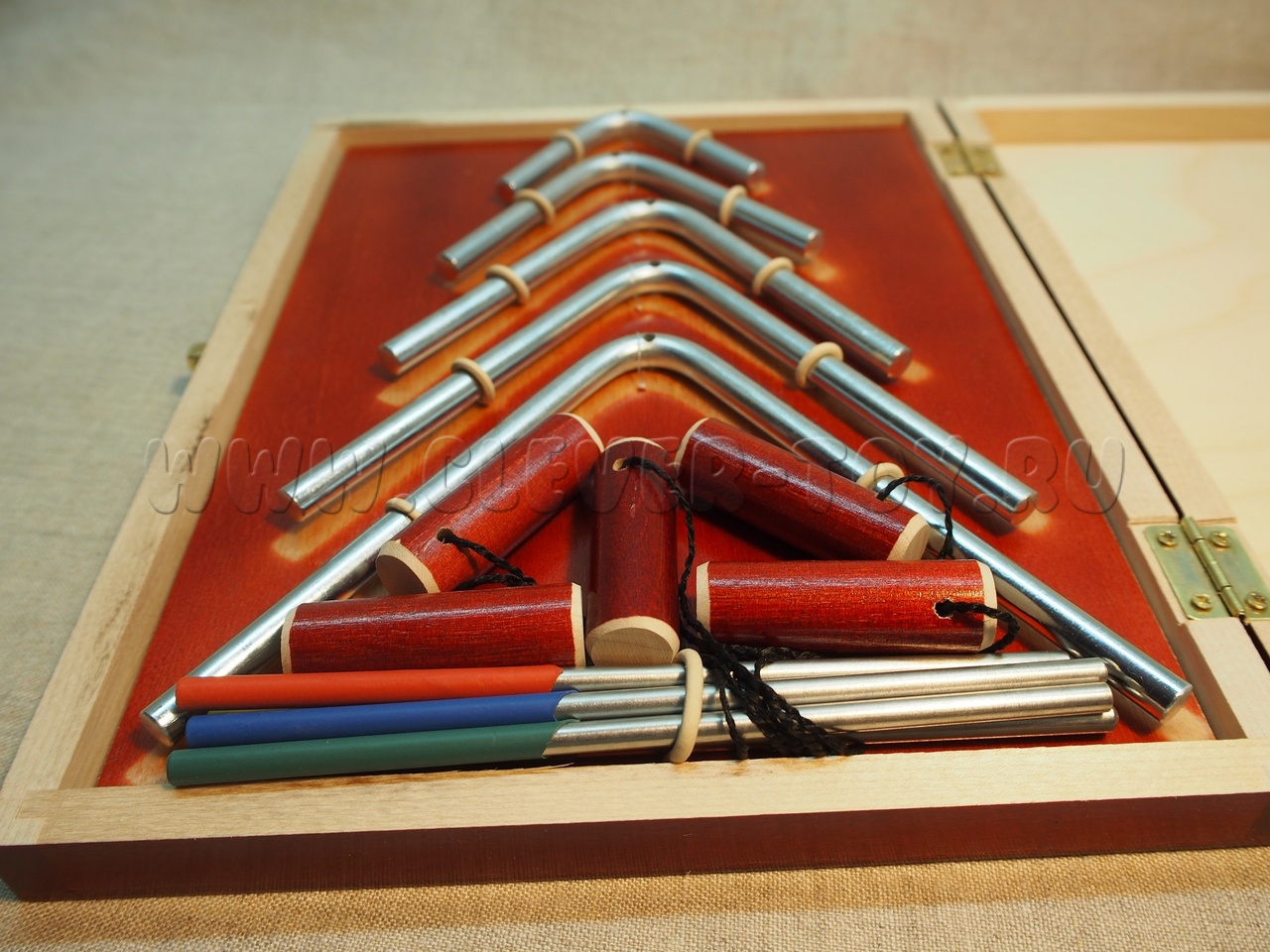 Угольники выполнены из стали диаметром 8мм. Гальваническое покрытие не ухудшает качество звука и не разрушается при механическом воздействии. Подарочный кейс с золочеными застежками.