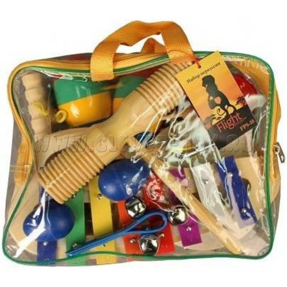 Перкуссионный набор FLIGHT FPS-10 состоит из 10-ти предметов, оформленных в красочном стиле: разноцветного металлофона с палочкой, круглого тамбурина с натуральной мембраной, пары разноцветных маракас, пары пластиковых кастаньет, пары шейкеров в форме "яиц", цимбал, гуиро, тон-блока, металлического треугольника с палочкой и джингл-стика.